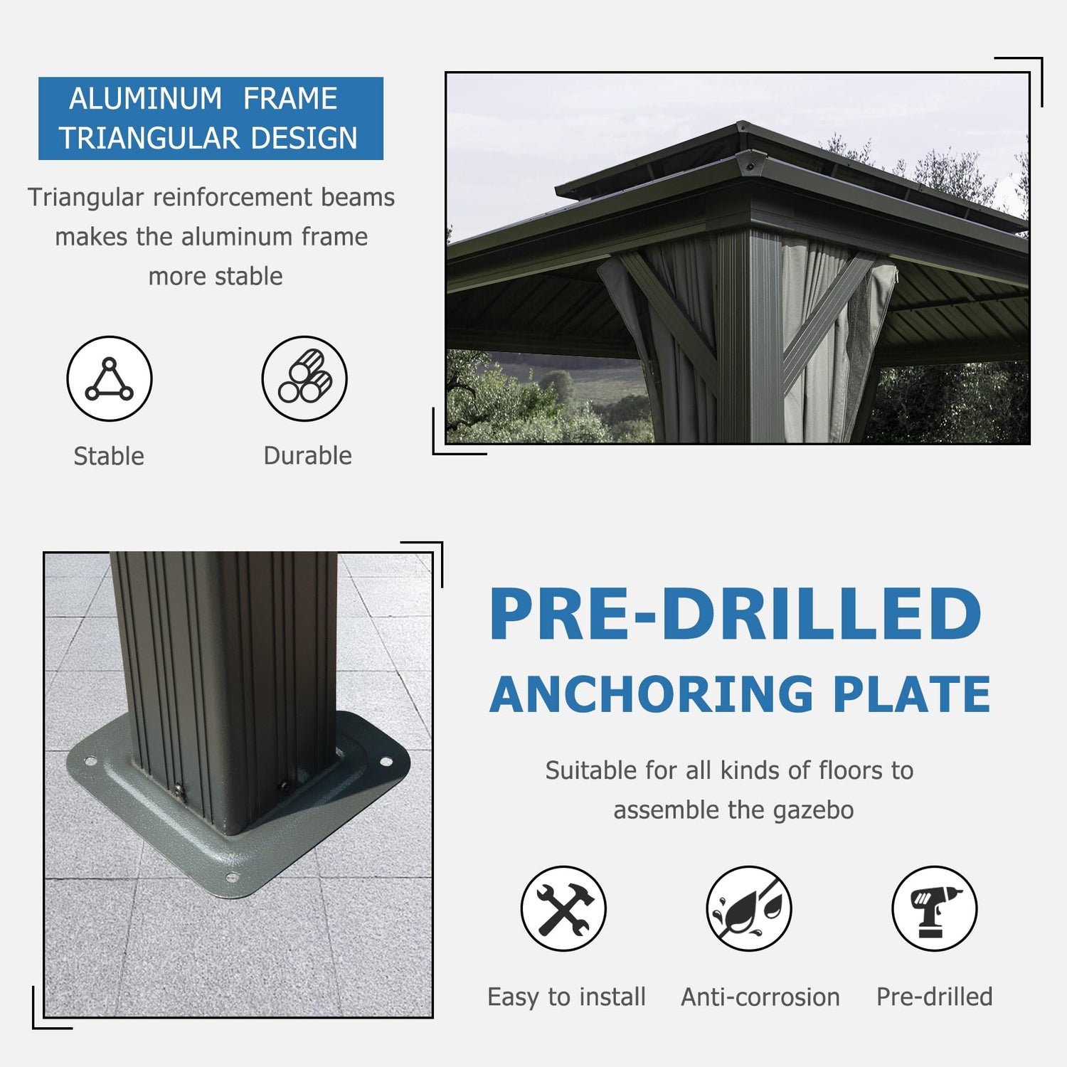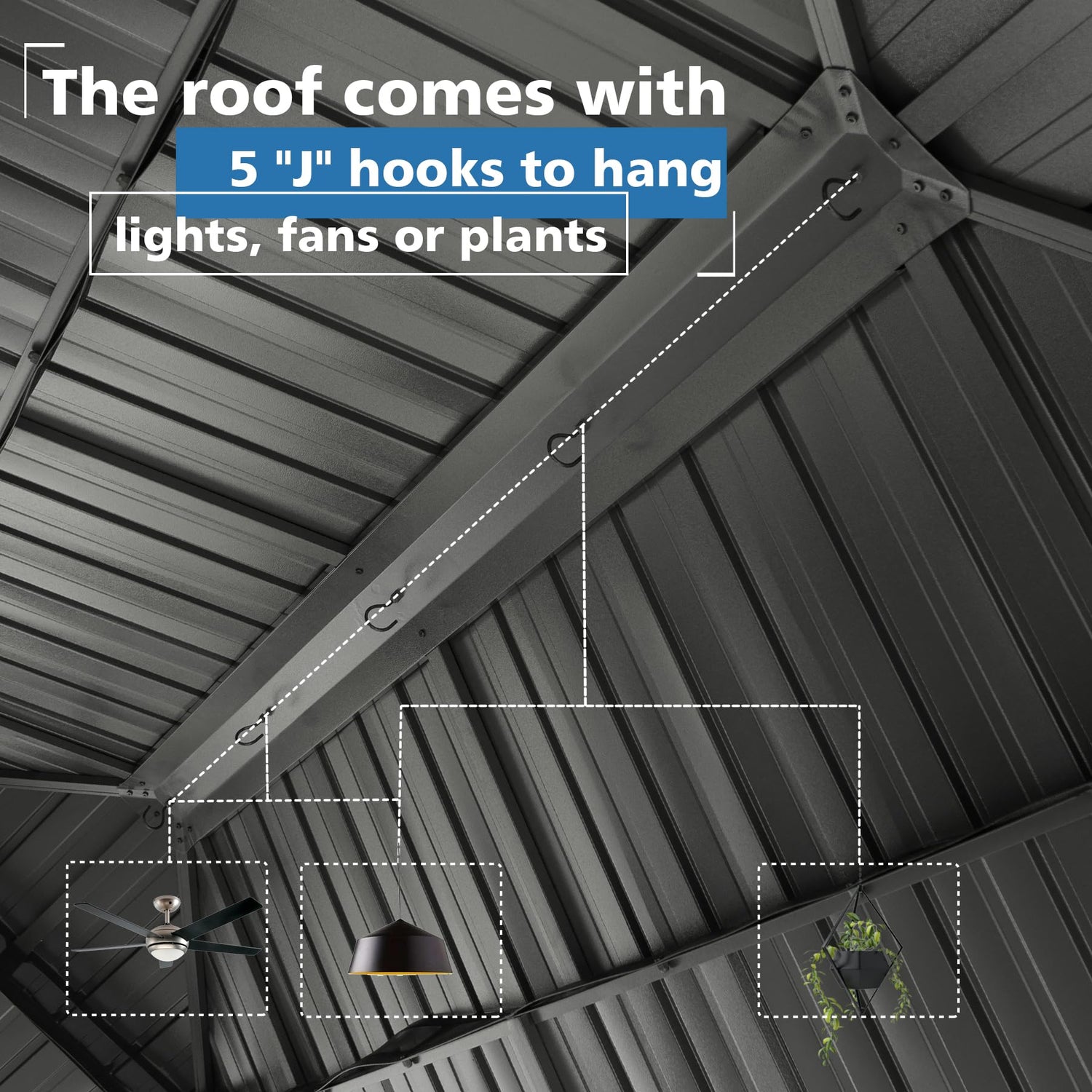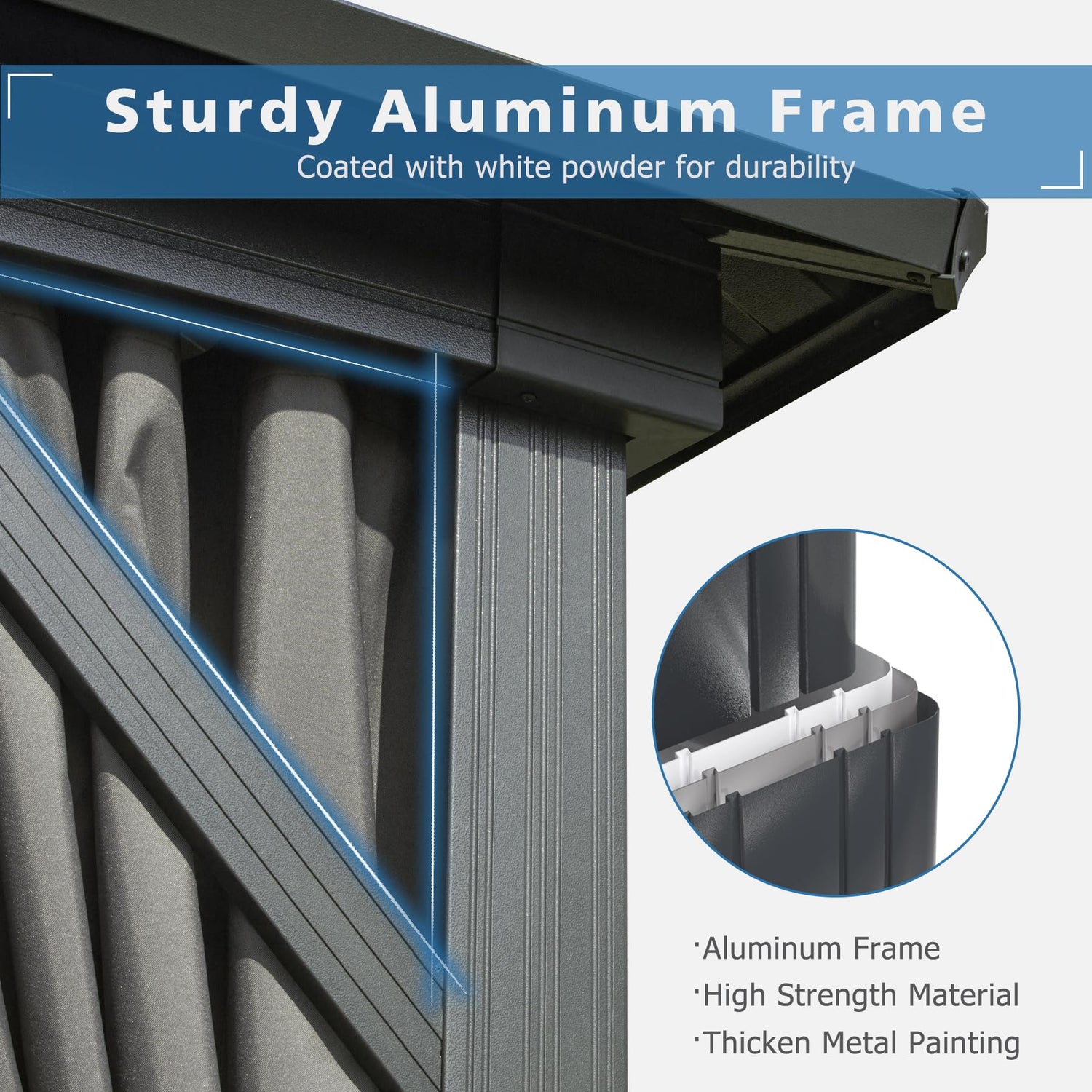 - 🌞Durable Premium Aluminum Frame- The backyard gazebo feature strong powder coated dark gray aluminum frame and galvanized steel roof panels, can easily withstand harsh weather conditions such as wind, rain and snow, and also resistant to fading, rust and corrosion.