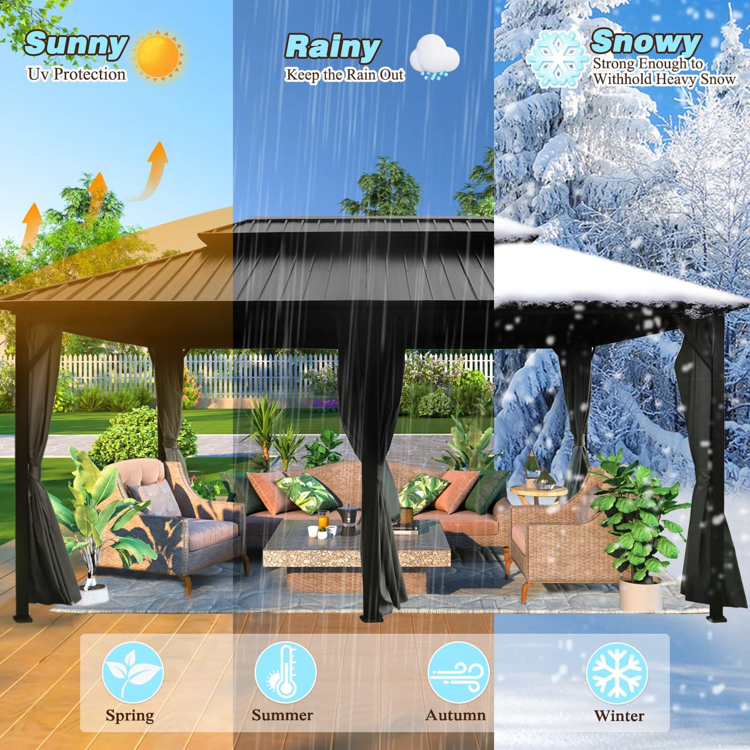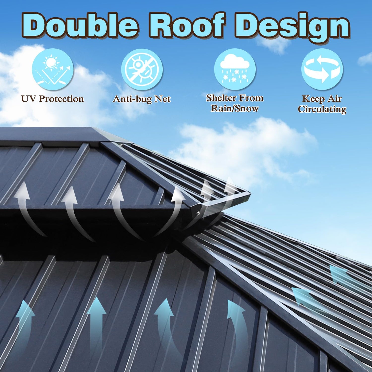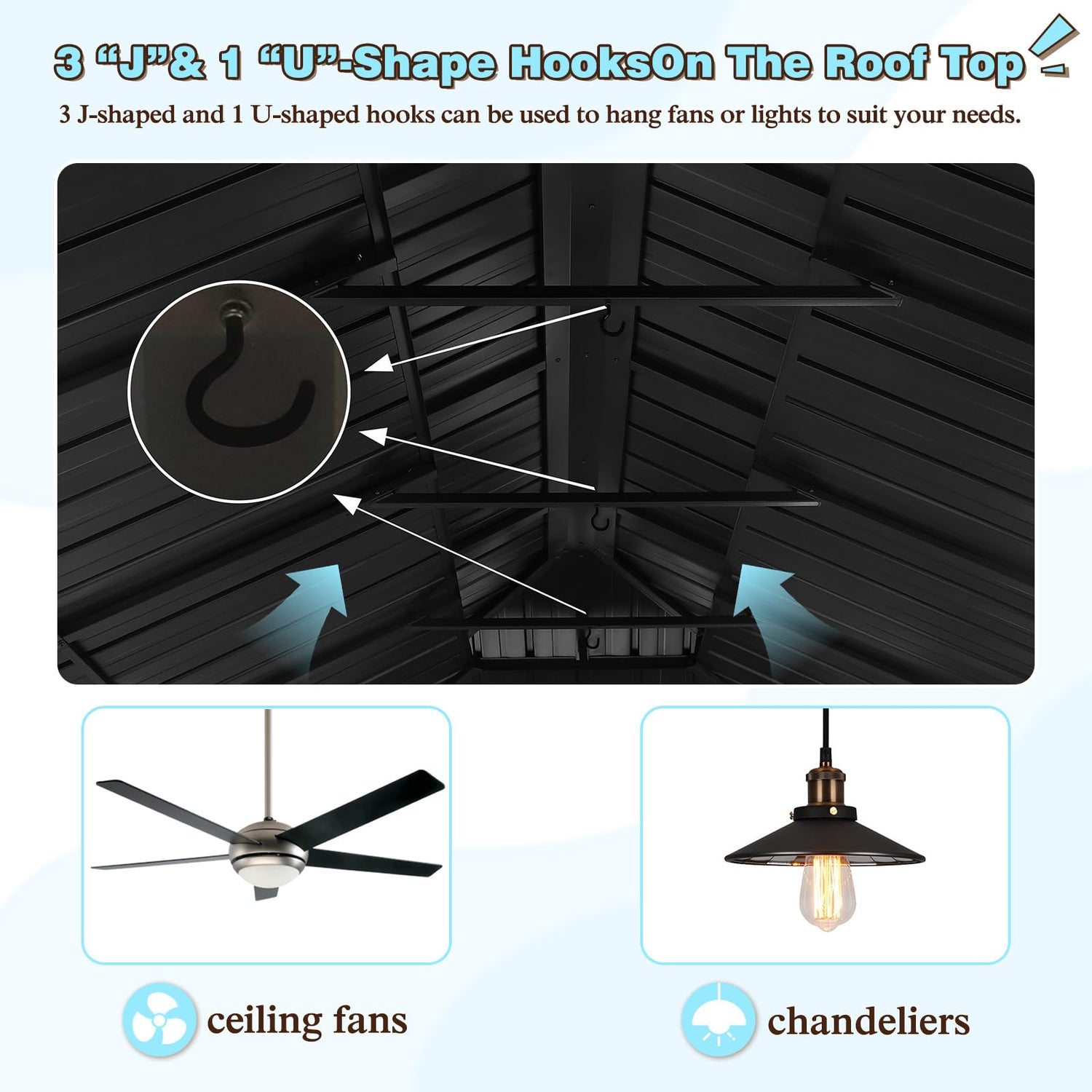 - ๐๐จ๐ฎ๐๐ฅ๐ ๐๐จ๐จ๐ ๐ฐ๐ข๐ญ๐ก ๐๐จ๐จ๐ค๐ฌ - Hooks on the top of the 20x12ft gazebo can be used to decorate and make the gazebo more versatile. Ceiling fans and decorative light strings can pass through the hooks and decorate the gazebo and your patio. And spend time with your friends and family. The gap between the 2 roof layers keeps air circulating inside the hardtop gazebo. The metal roof effectively insulates and keeps the interior of the gazebo cool.