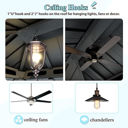 - Hanging Hooks: This double roof gazebo is equipped with hanging hooks. You can hang lights, lamps or lanterns to light up your outdoor night time, or hang heaters, fans or plants as a decoration. It' s all depends on you