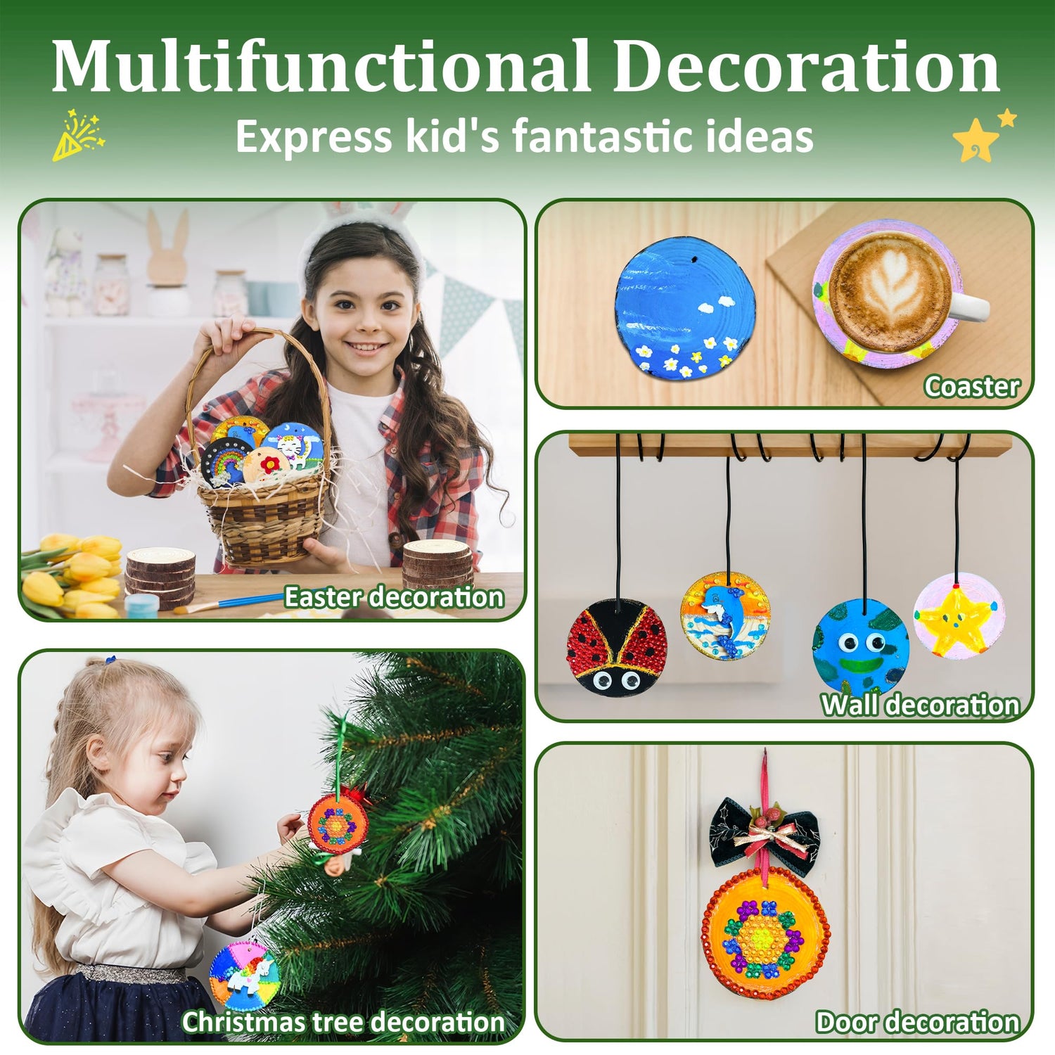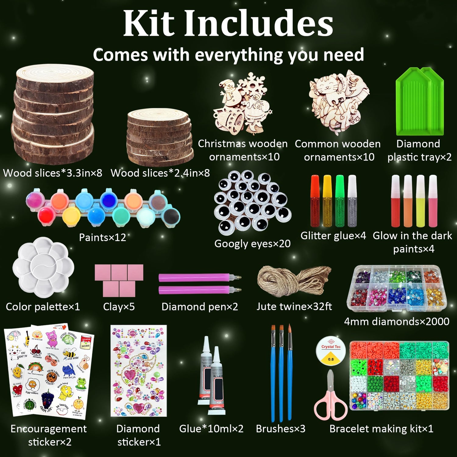 - Kit Includes: 16 wood slices (S & M size), 10 wood cartoon ornaments, 10 christmas wood ornaments, 3 brushes, 1 color palette, 2000 diamonds, 2 diamond tray, 5 clay, 2 diamond pen, 20 wiggle eyes,1 diamond sticker, 2 encouragement sticker, 32ft jute twine and 1 christmas bracelets kit