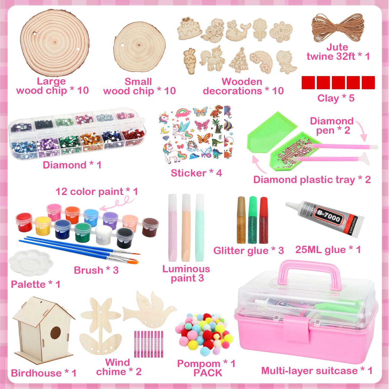 - 【Super Value Wooden Painting Crafts for Kids】Luucio wooden arts and crafts for kids are full of dazzling ornament sets to attract kids' eyes! Kids ornament-making kit includes 10 large wood chips, 10 small wood chips, 10 wooden decorations, 2 birdhouses, 2 wind chimes, 3 glitter glue, jute twine, 3 Glow paints, 4 stickers, 2400 acrylic diamonds, 2 diamond pens, 2 diamond plastic tray, 5 clay, 12 color paint, 3 brush, palette, 25ml glue, instruction manual, pompoms, and a multi-layer suitcase you can carry them!