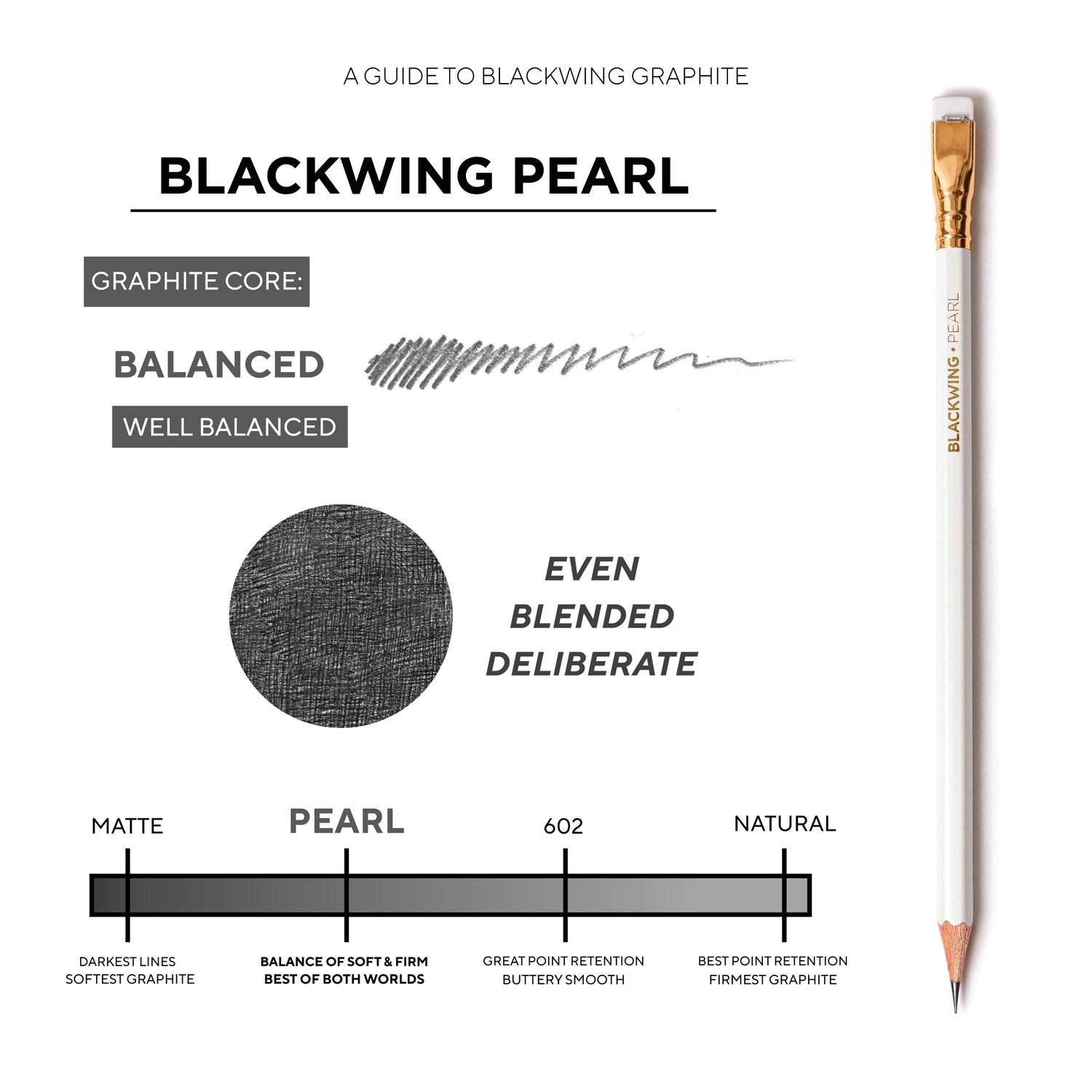 • PERFECT FOR ILLUSTRATORS AND CALLIGRAPHERS – With our balanced and smooth Japanese graphite core, Blackwing Pearl pencils are perfect for illustrators, UI/UX designers, and woodworkers. Use for a line that is softer than the Blackwing 602, but firmer than the Blackwing, and all without excessive sharpening.
