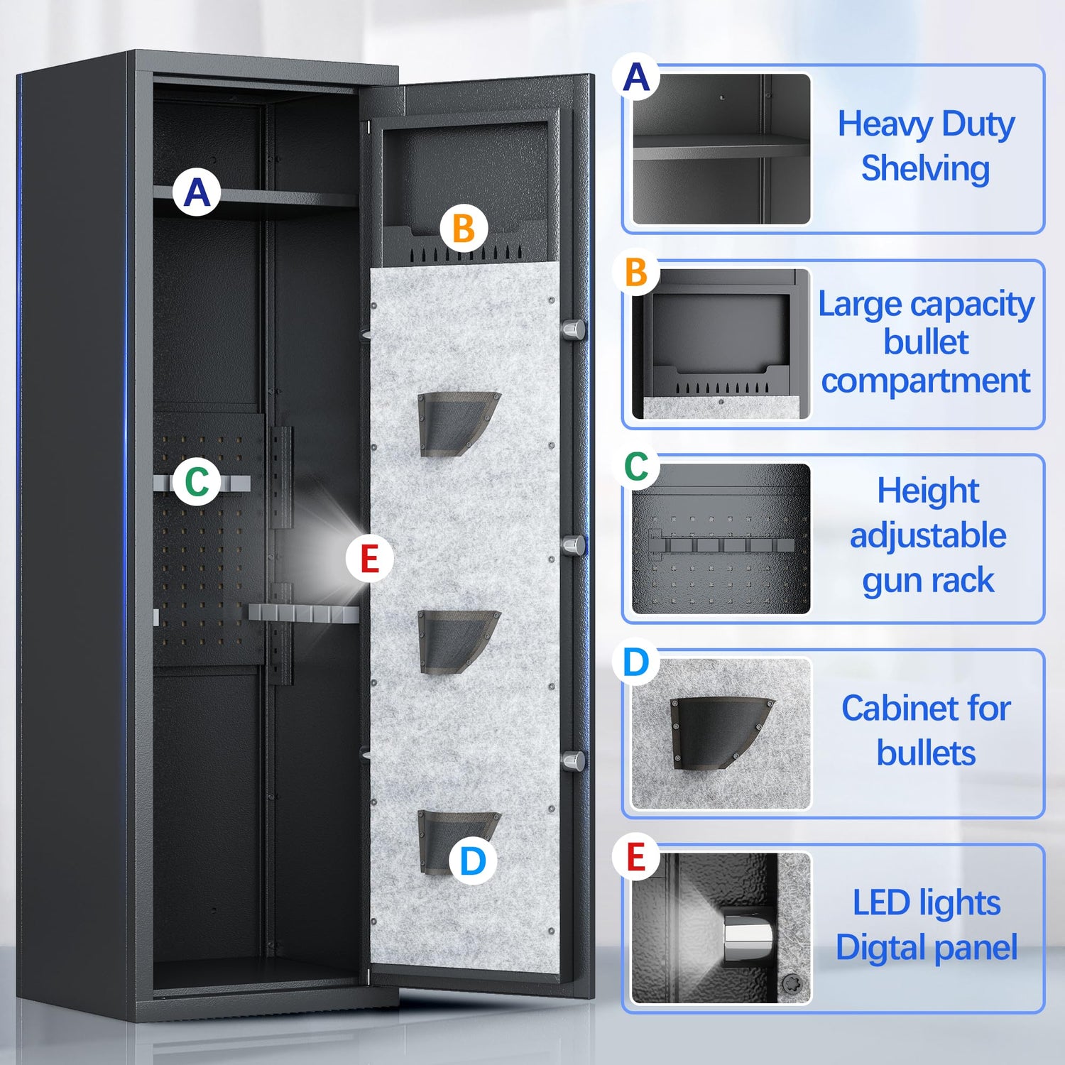 10-15 Large Gun Safe Cabinet With 3 Pistol Pouches,rifle Gun Safes for Home fireproof waterproof Adjustable Rack and Biometric Lock,Heavy-Duty Gun Safes for Rifles and Shotguns Money and Valuable