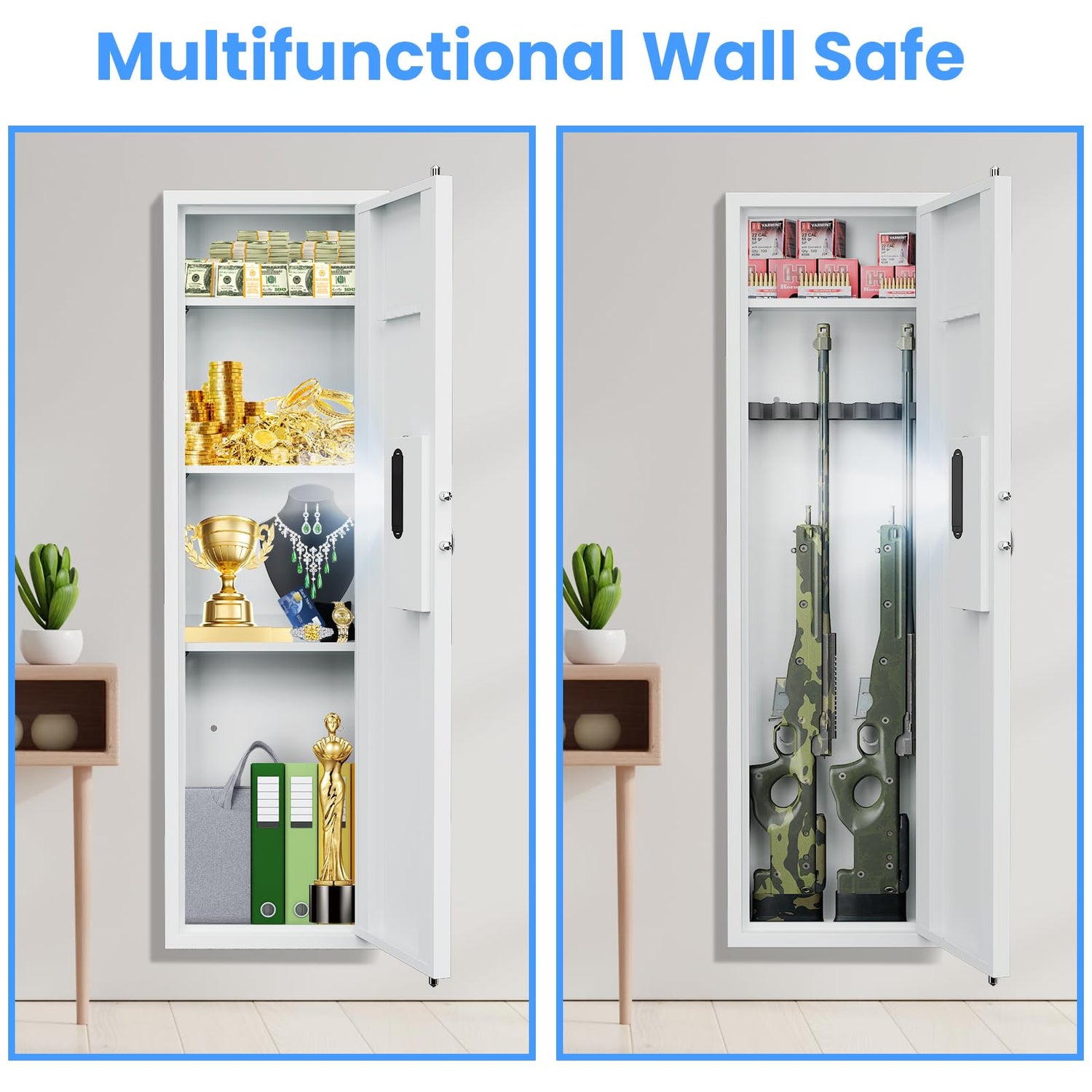 2024 NEW 53.15” Wall Gun Safe, Fingerprint Wall Safe Between the Studs with Dual Alarm & Mute Mode, Hidden Wall Gun Safe for Rifles and Pistols with Adjustable Shelves, Magnetic Gun Support & Key Hook