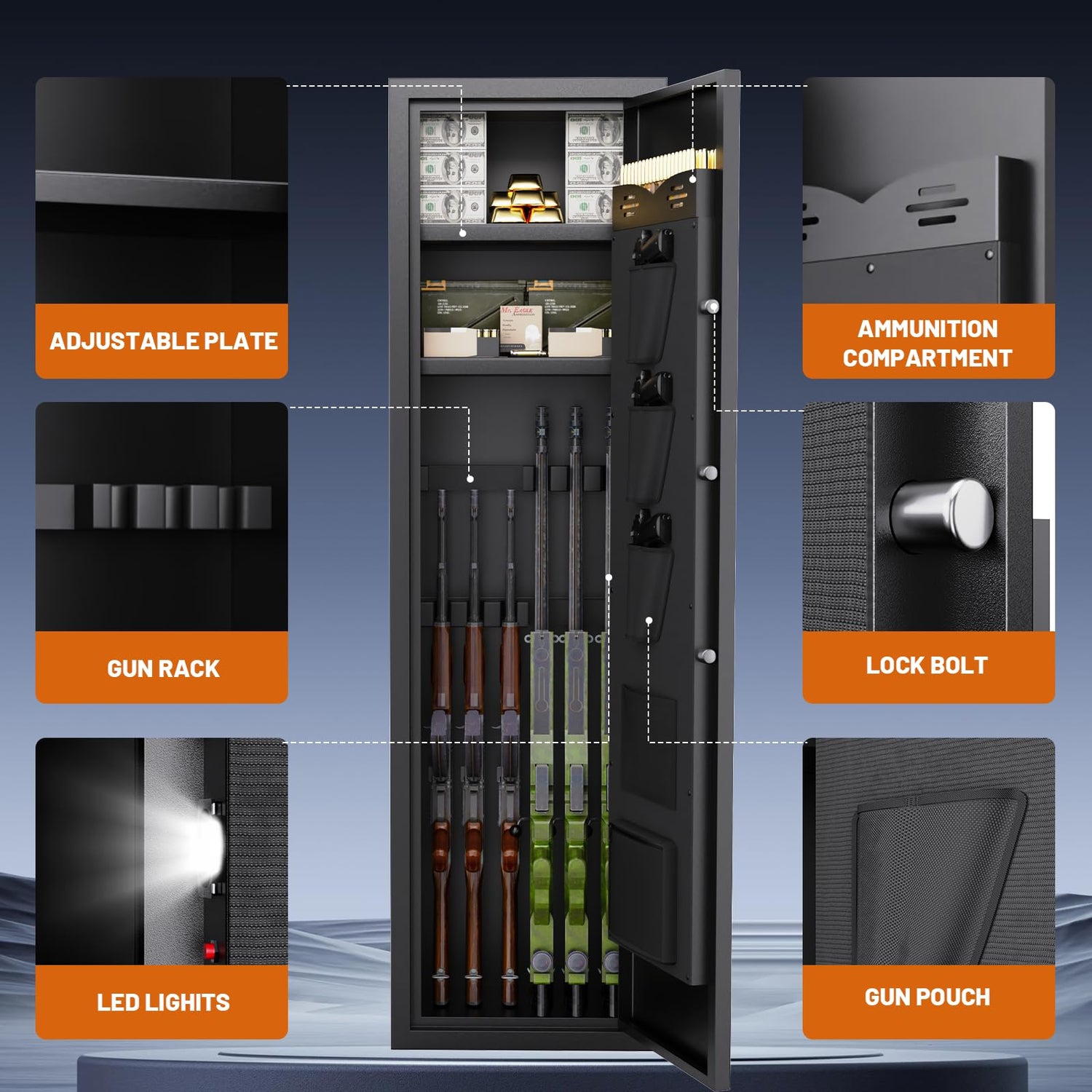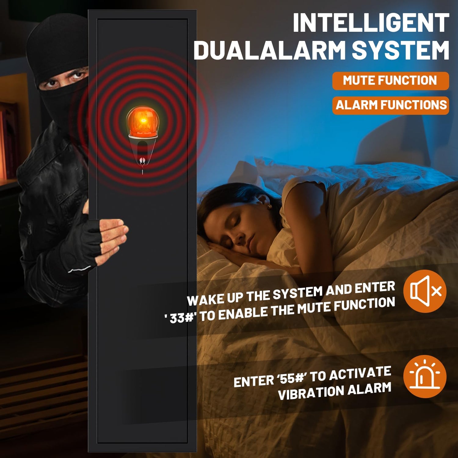 - 【Alarm Device】This gun safe is equipped with an alarm device, which will be activated when the wrong password is entered three times and the wrong fingerprint is entered five times, which better protects the safety of your valuables. At the same time, you can activate the vibration alarm device, after the vibration alarm device is activated, no one can open your gun cabinet by violent means.