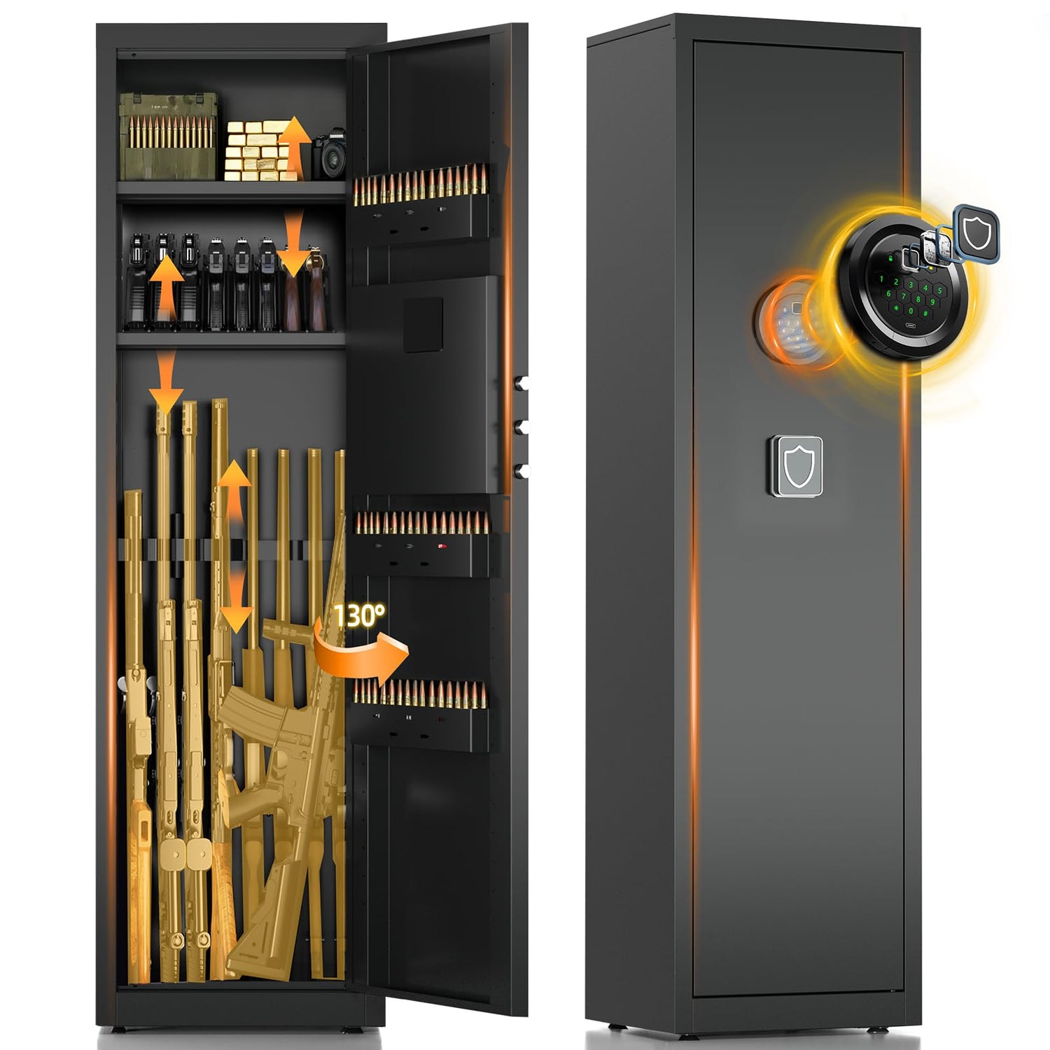 - 【Bigger Panel Design & 130°opening Door】 The gun safe has innovations on the basis of the original gun safe: ①The panel buttons of the gun safe are bigger than the previous one, and the unique handle design is more convenient for Americans to use. ②This gun safe is designed with a larger opening angle, which can be easily opened up to 130 degrees, making it more convenient to access firearms. This design prevents you from hitting the door or your elbow when reaching for your gun.