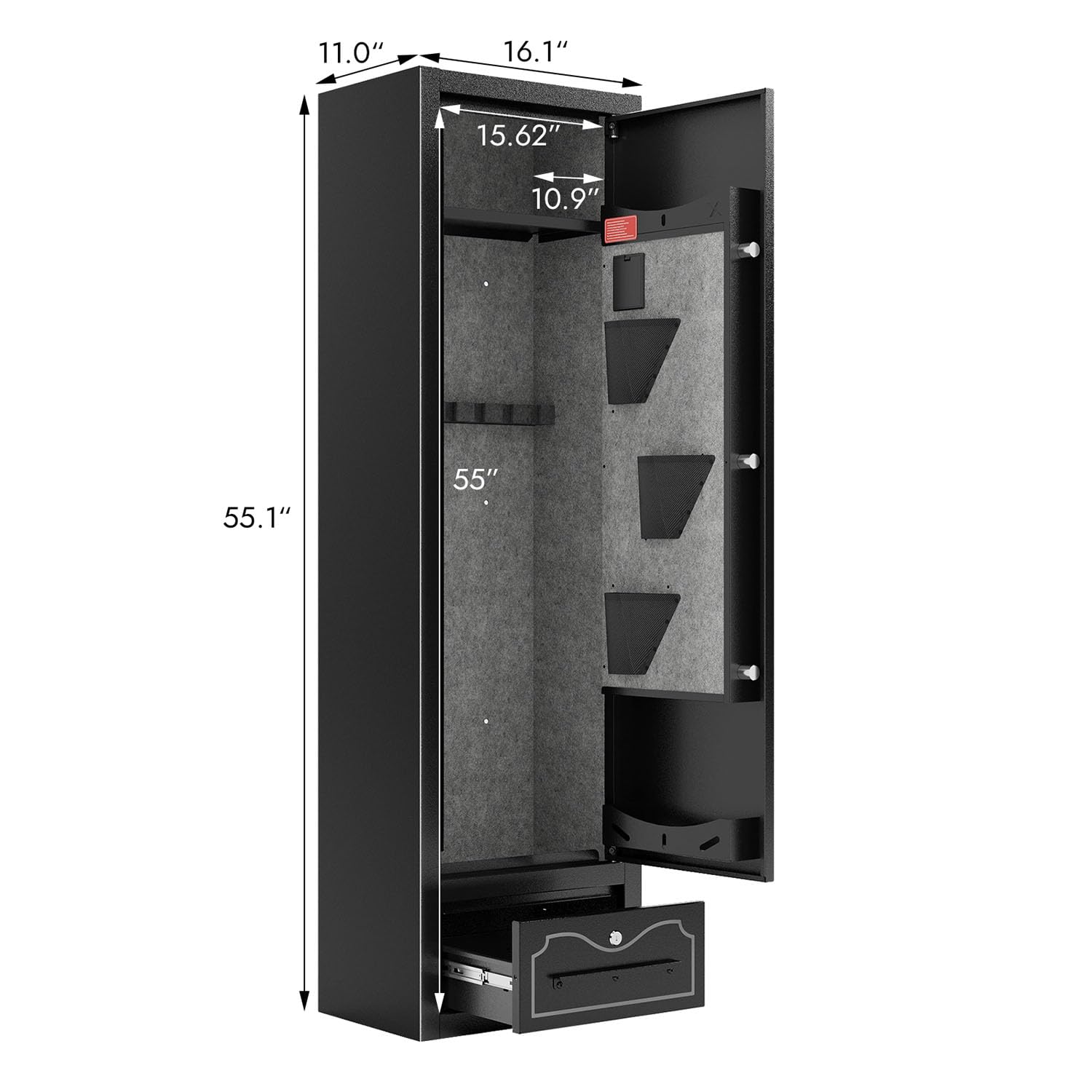 - 4. Configurable Armory Management System: Optimize space with adjustable rifle racks, a detachable shelf, and a dedicated ammo drawer. Converts seamlessly into a versatile security cabinet for documents, jewelry, or emergency supplies alongside firearms.
