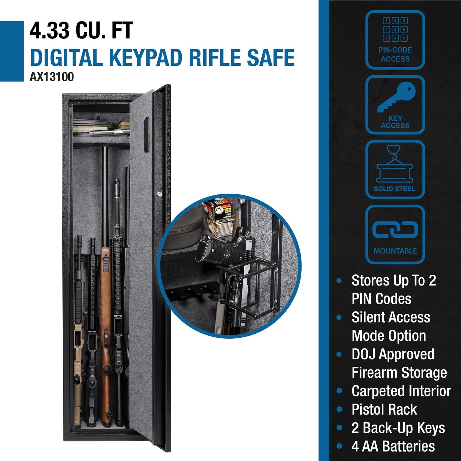 Details: The 4. 33 Cu ft. digital keypad rifle safe by Barska is a great way to keep rifles and other firearms securely stored and readily accessible. This rifle safe features a quick-access digital keypad that retains up to 2 unique pin codes, giving users the ability to retrieve their firearms at a moments notice. The digital keypad rifle safe includes a 5 position rifle rack, two position handgun rack and two removable shelf for extra accessories.