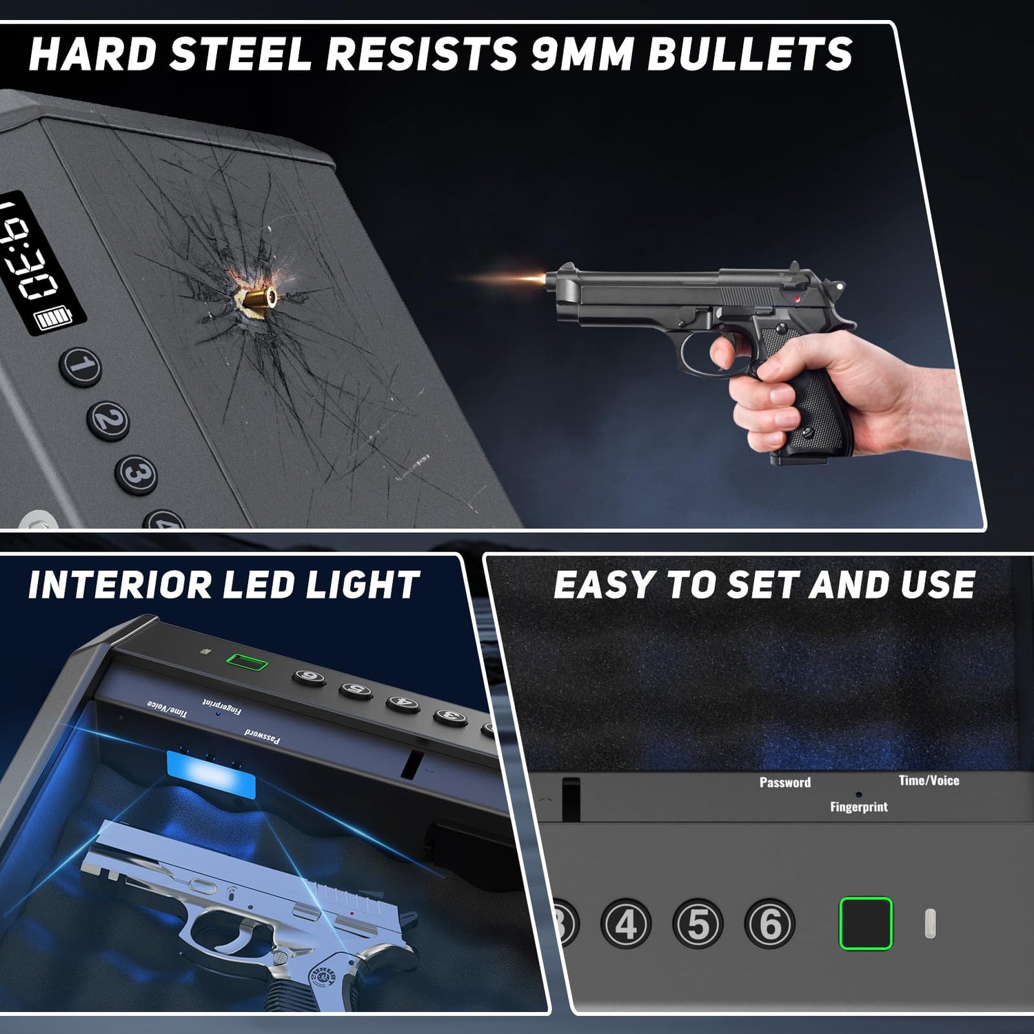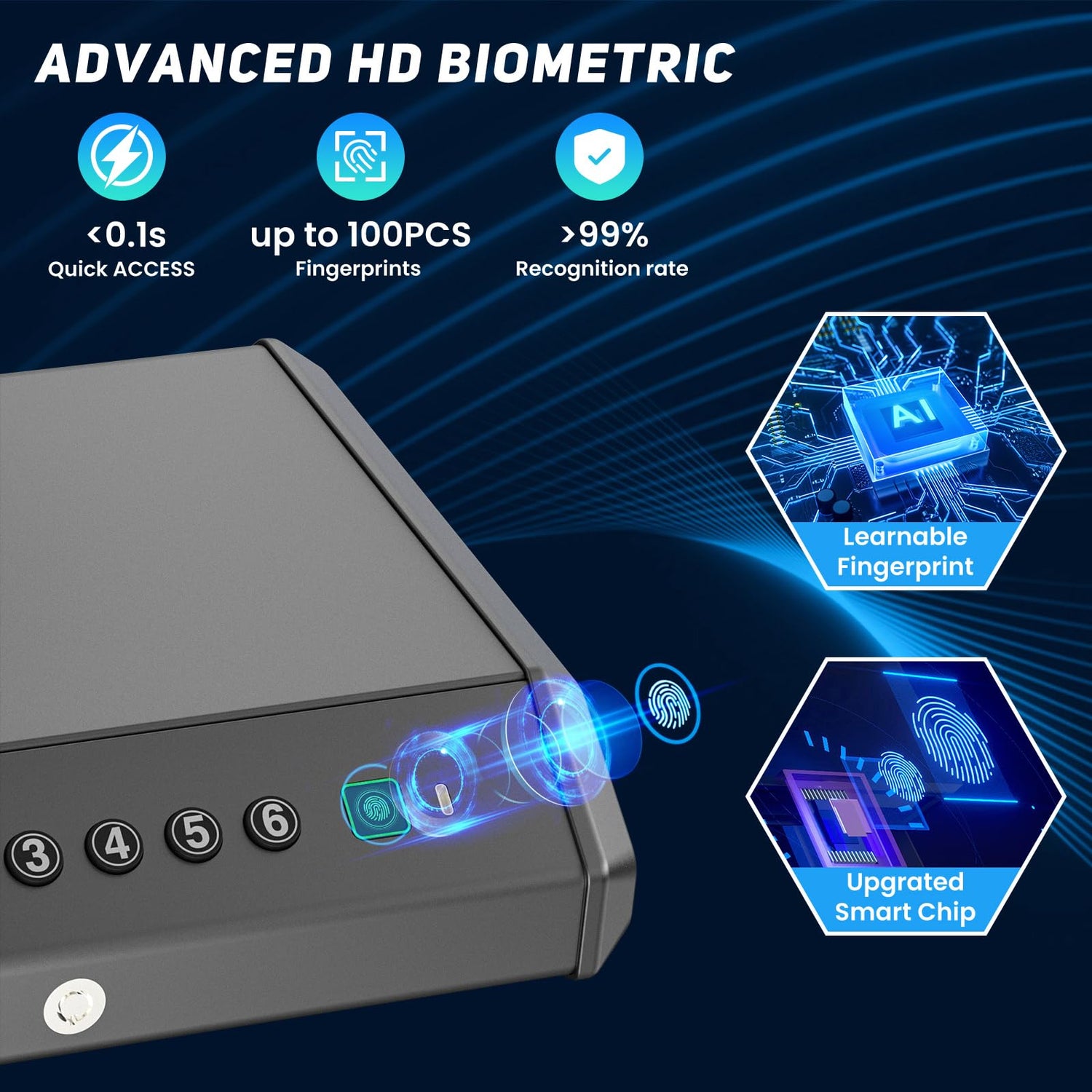 - 0.1S Biometric Quick Access Pistol Safe: The 0.1S Biometric Quick Access Pistol Safe offers seamless, secure, and ultra-fast access to your firearm. Featuring advanced biometric technology, this pistol safe unlocks in just 0.1 seconds with your fingerprint, PIN, or key. The high-resolution fingerprint scanner uses self-learning technology to improve accuracy over time, ensuring quick access with the touch of your finger.