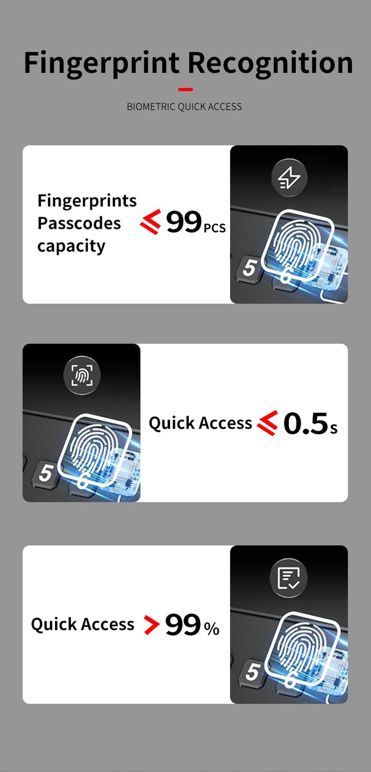 - [Super fast fingerprint unlocking, supporting 99 sets of fingerprint storage] 0.5 seconds of fast recognition, high-sensitivity fingerprint sensor, can accurately identify wet hands and stains. 99 sets of fingerprint storage, authorized for quick access by family members or emergency contacts.