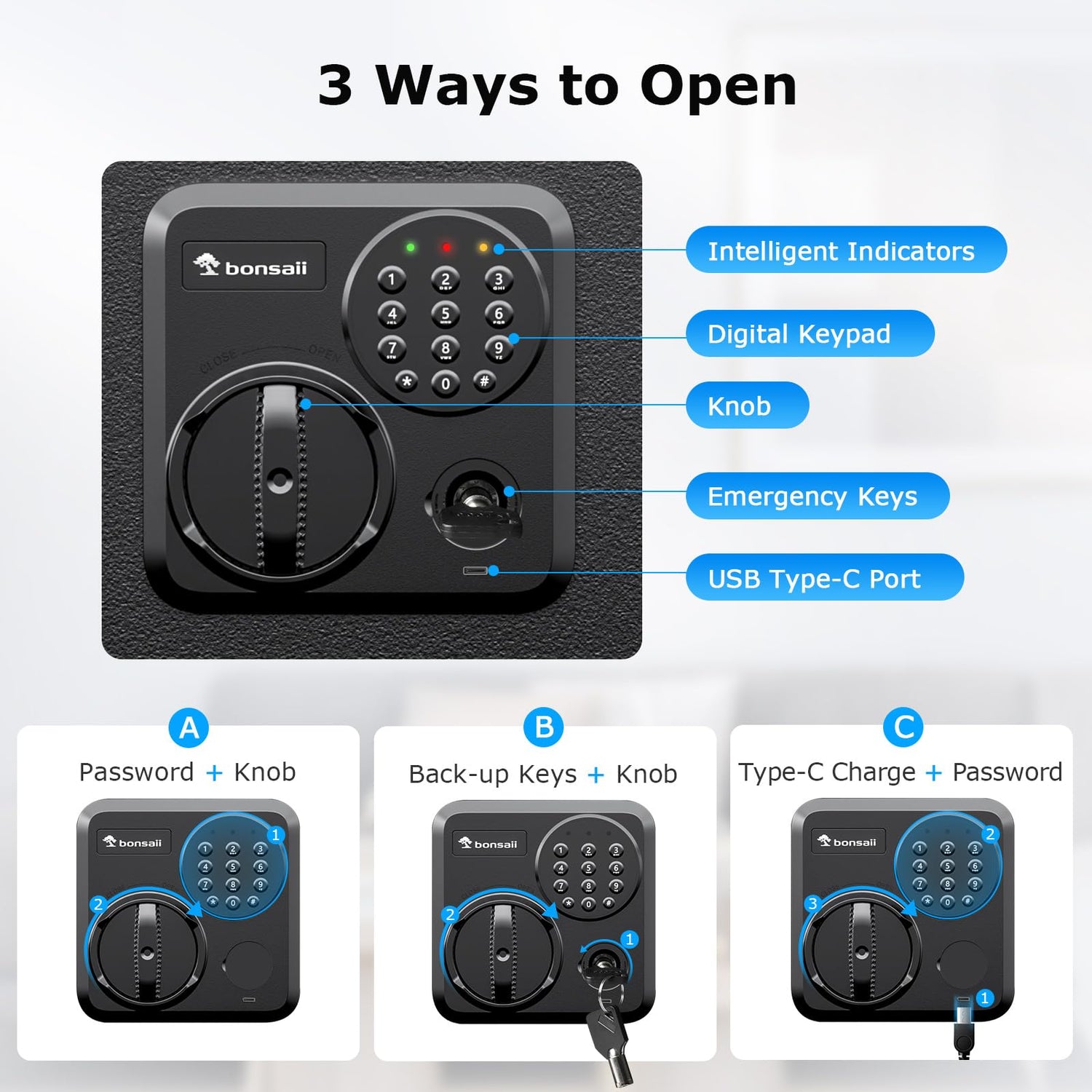 • Anti-Theft Digital Safe Lock: The safe's electronic lock offers 2 unlocking methods: 3-8 digit code or key. A Type-C port lets you charge the lock externally, preventing battery failure