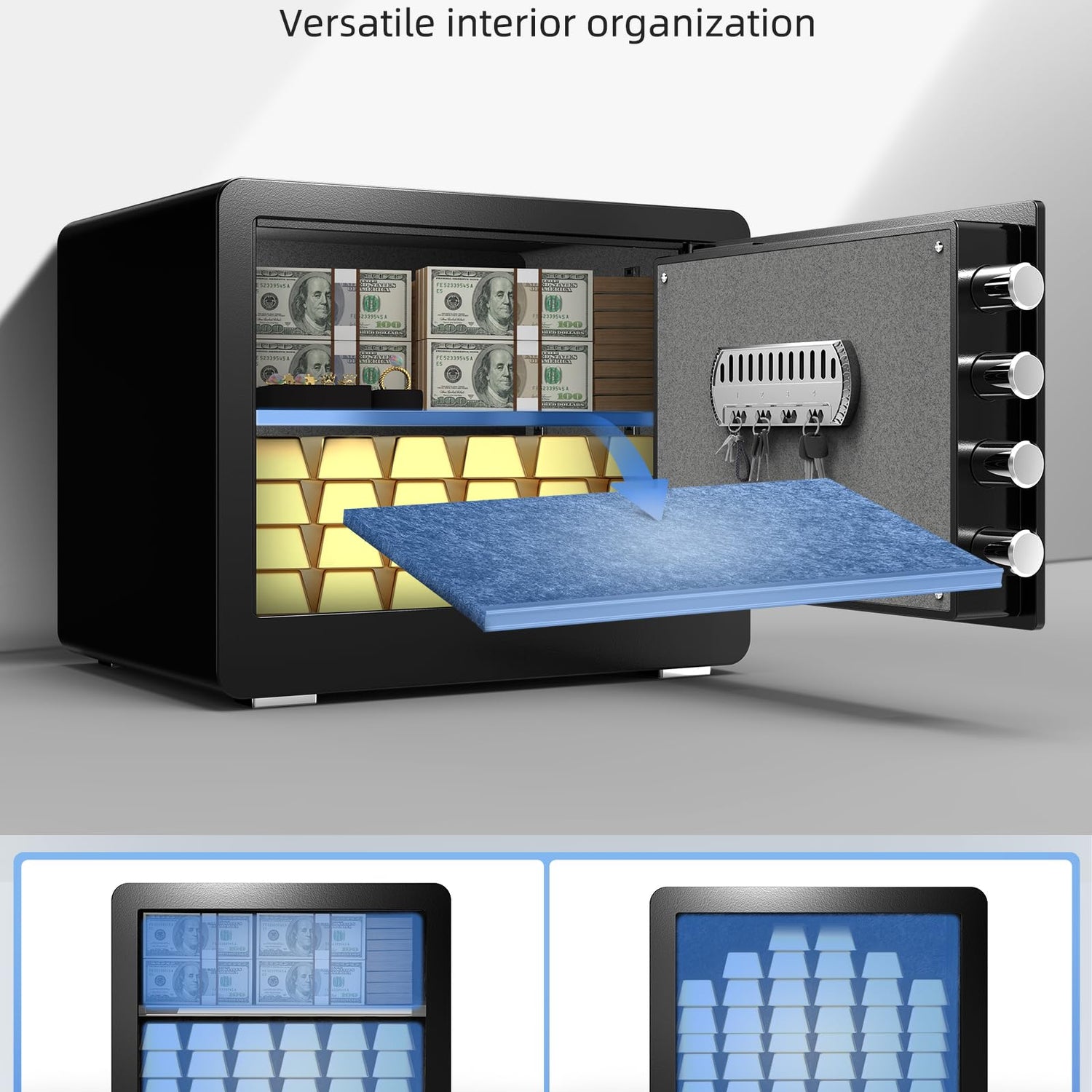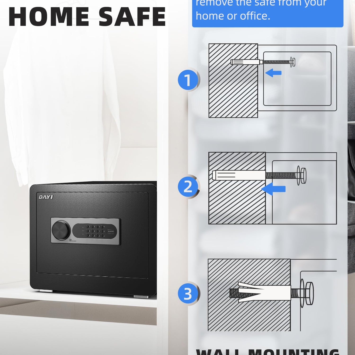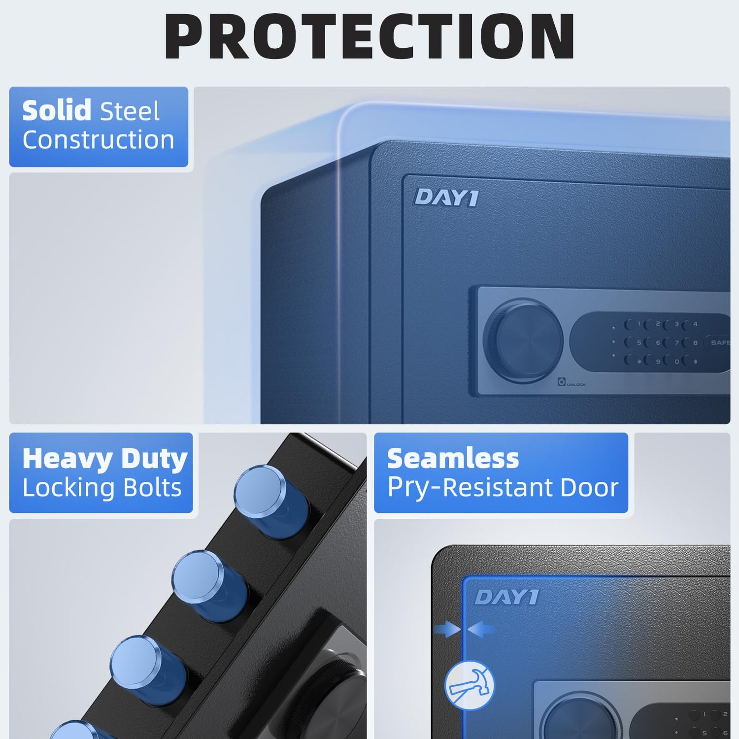 - UNMATCHED SECURITY PROTECTION - The DAYI safe box is crafted with cutting-edge one-piece bending and precision laser-cutting technology, pry-resistant door and 4 x 0.8inch live-locking bolts provide durable and reliable protection. Also, the advanced locking technology that resists both physical attacks and lock manipulation, our safe keeps your valuables secure.