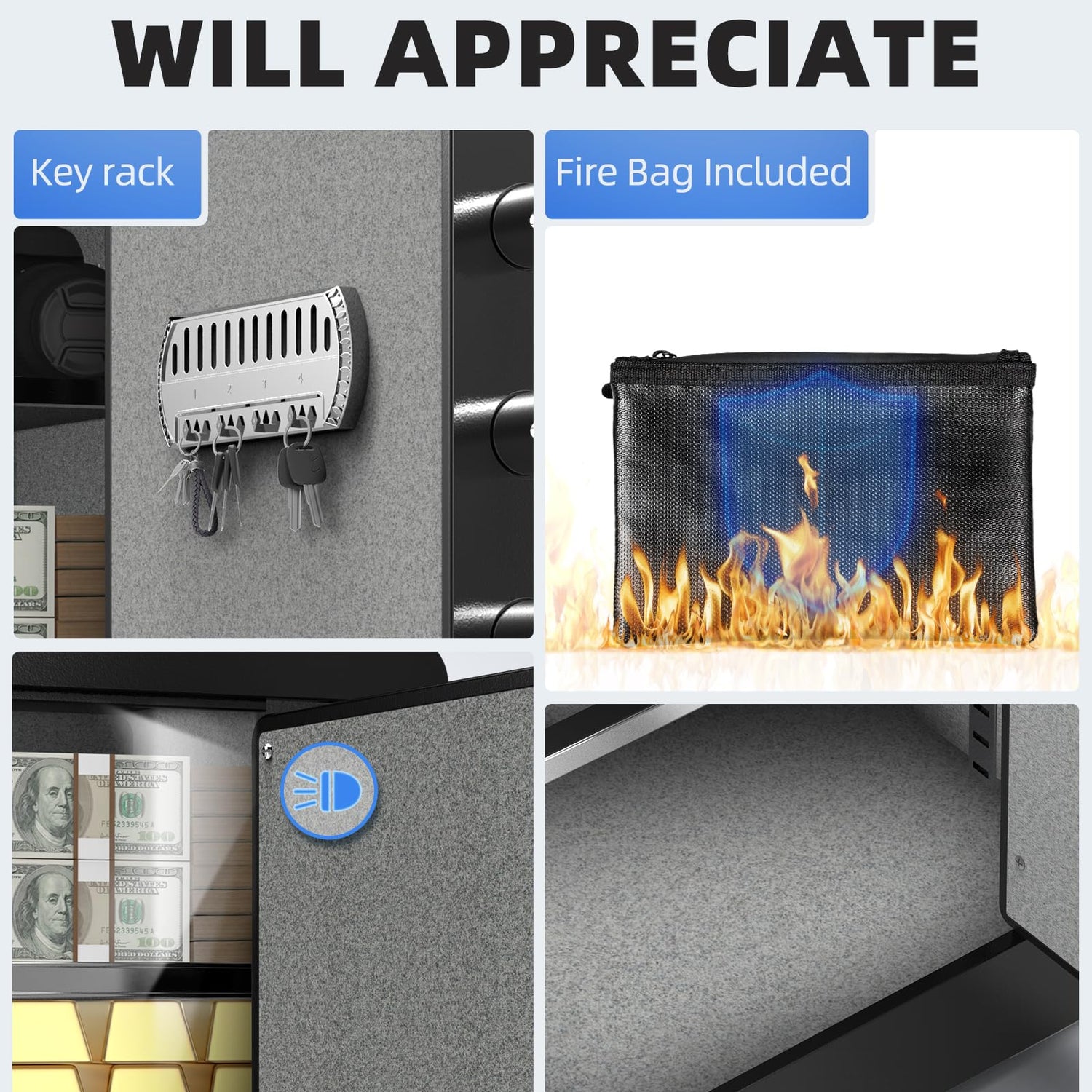 - VERSATILE INTERIOR ORGANIZATION - Our safe box provides ample space and customization with a removable shelf and built-in hooks for optimal organization. Plus, it features an integrated LED sensor light for effortless access to your belongings, even in the dark. We also enhances interior protection with a custom carpet interior to keep your important valuables protected from damage during storage.