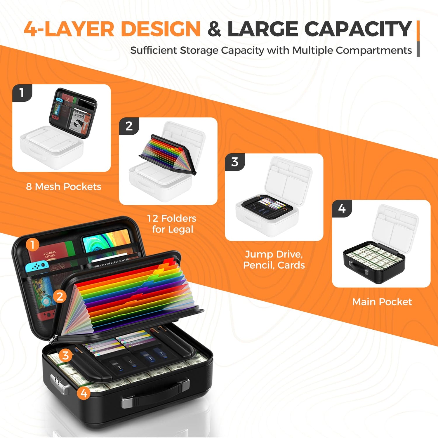 • Large Capacity & Multi-Compartment Storage: With a size of 15.8 x 11.8 x 5.4 inches, this fireproof document box provides ample space. It features 12 accordion folders, 2 main mesh pockets, 16 card slots, 2 USB pockets, and 4 pen slots
