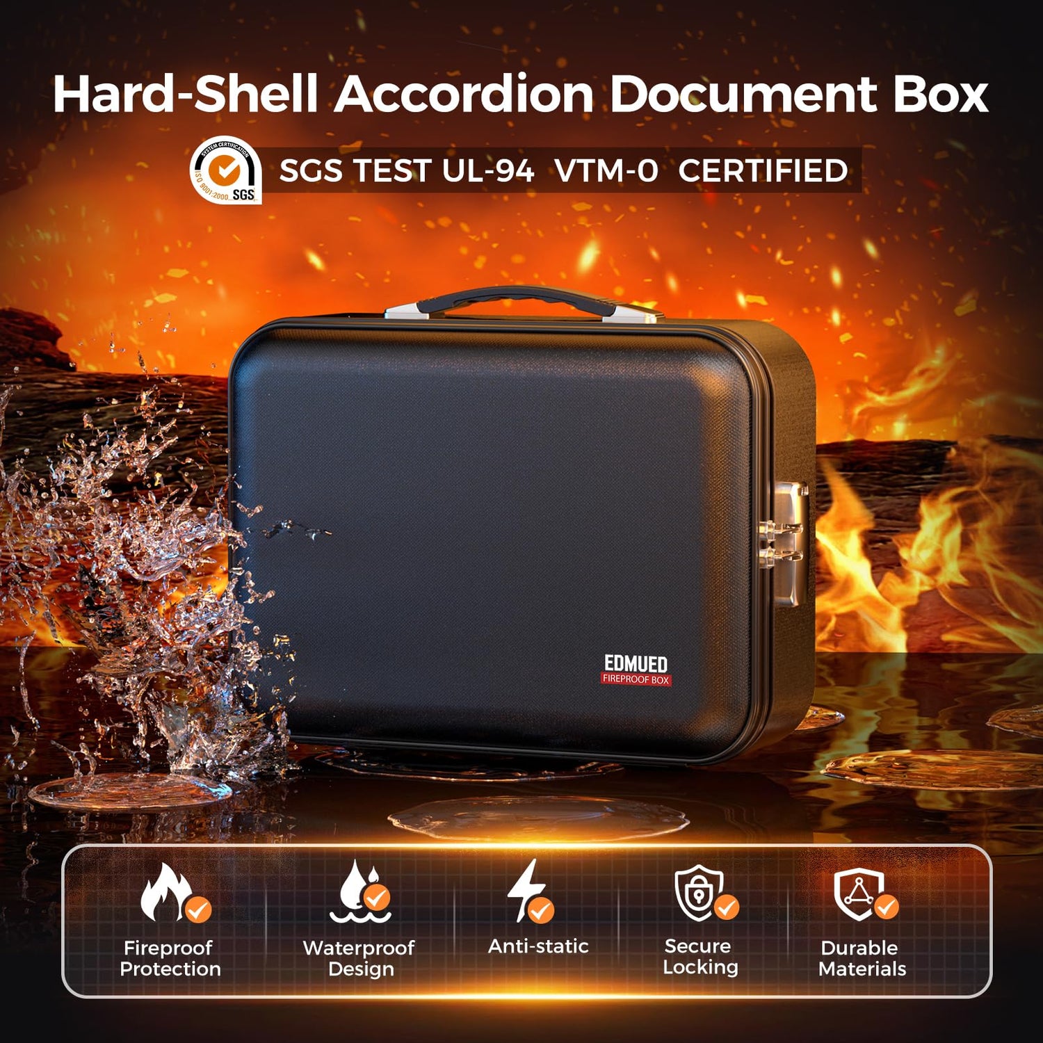 EDMUED Fireproof Document Box with Combination Lock, Fireproof Water Resistant Hard Case Safe Box for Important Documents Certificates Laptop Passports (Black)