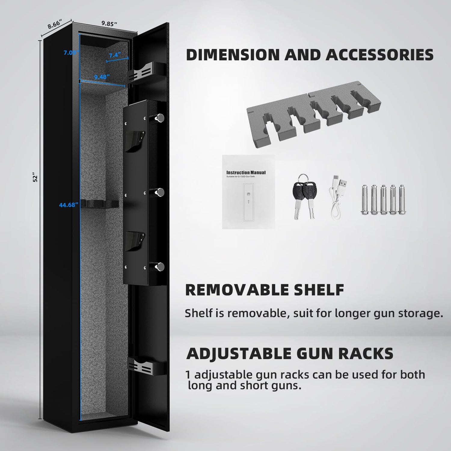 - 【3 Gun Safe with Removable Shelf 】This gun safe measures 9.8"D x 8.6"W x 51.9"H. This gun safe can hold up 3 rifles or shotguns up to 44 feet in length (not including scopes). You can adjust the storage space by adjusting the shelves. A safe and convenient storage solution for your firearms.
