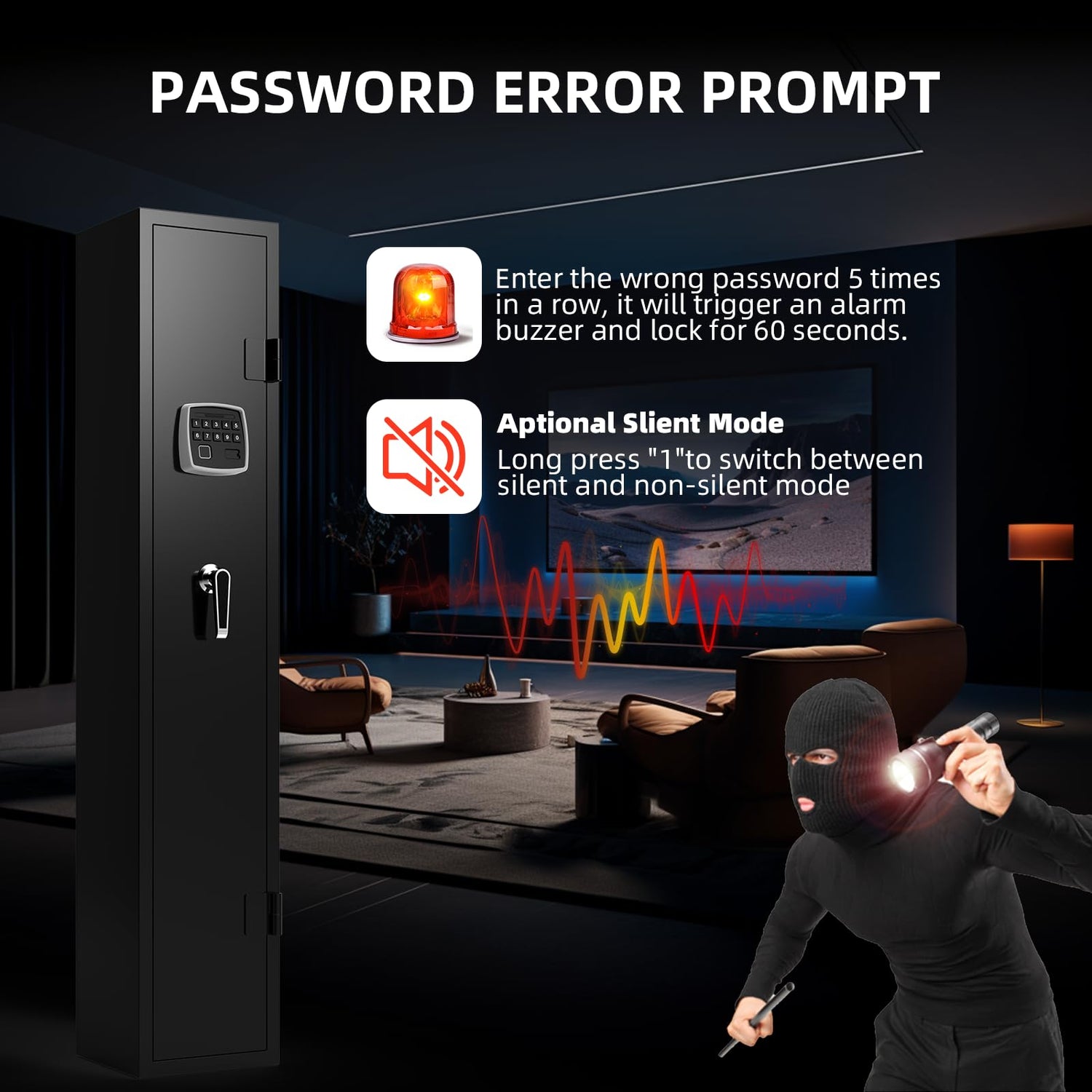 - 【Alarm Function and Mute Mode】Gun safe for rifles and pistols have smart alarm system and mute mode. If there are 5 times in a row incorrect password attempts or forced entry attempts, the rifle gun cabinets will beep for 60 seconds without interruption, you can input the correct password to cancel the sound or by openning the safe with the key and removing the batteries. Silent function. Long press "1" to switch between silent and non-silent modes.