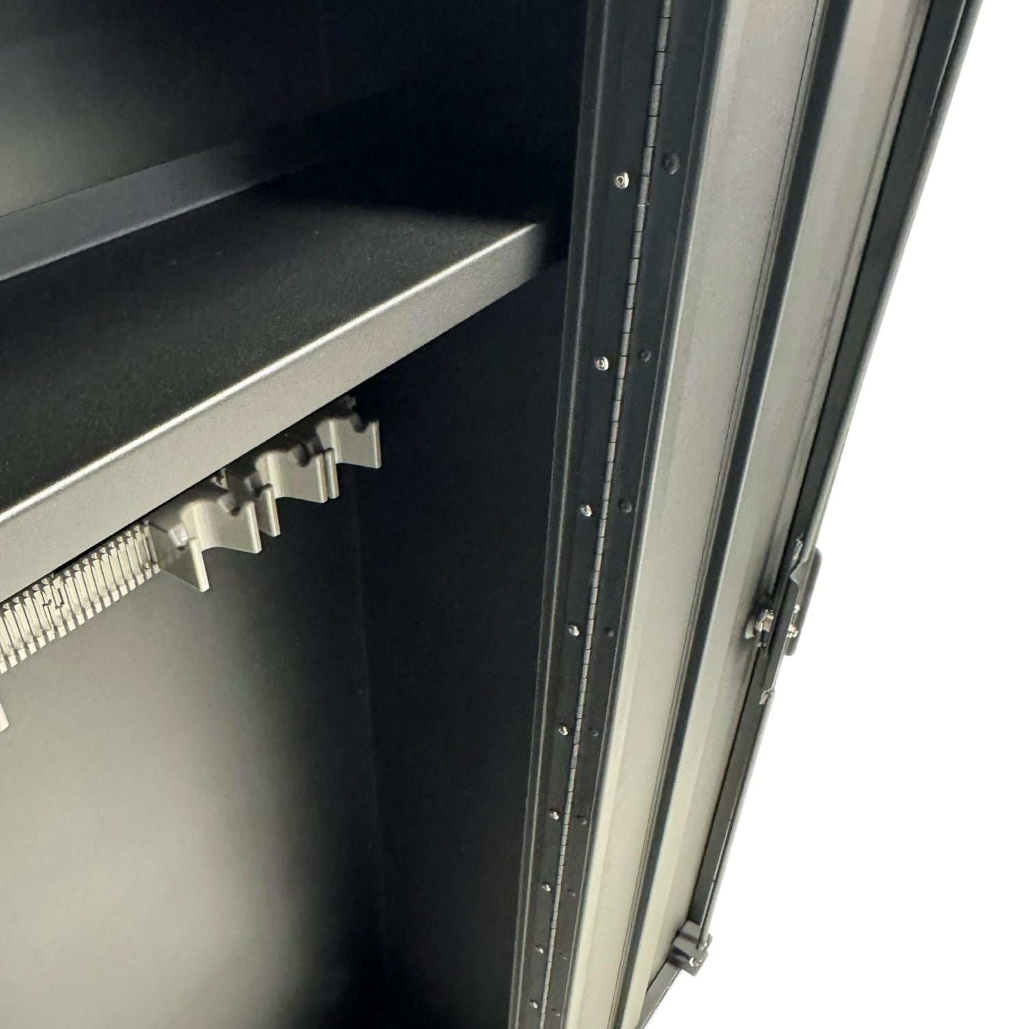 - INTERIOR LAYOUT: Features a top shelf for ammunition or accessories, plus a main compartment with gun rack for vertical storage