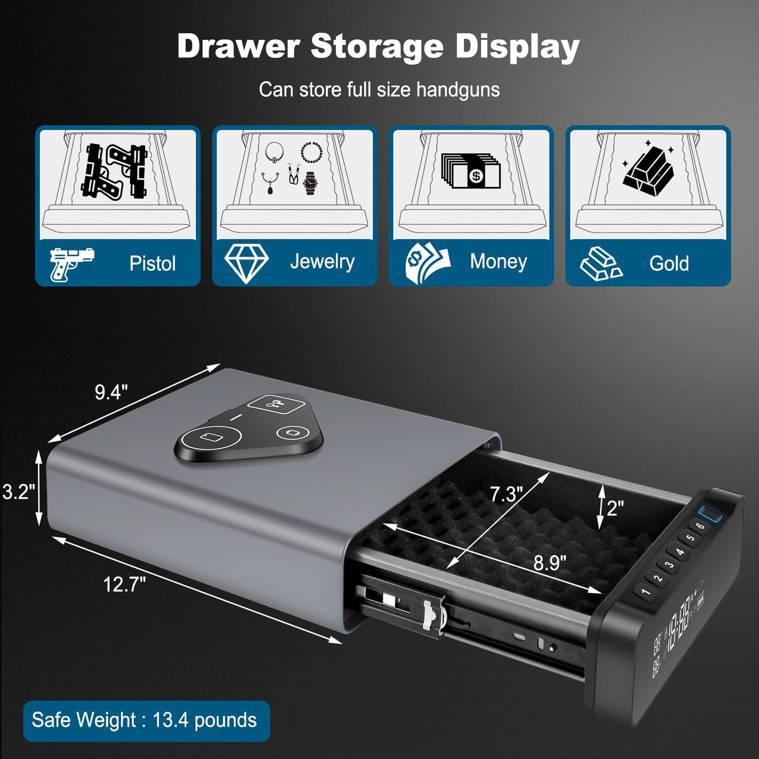 • ✅【Exterior Dimensions】 12.7"D x 9.5"W x 3.4"H. Deluxe quick-access firearm safe for 2 handguns or 1 handgun and some magnizines or other personal items. Stores great on a night stand or desk, at bed side, in a closet or inconspicuously in a vehicle.