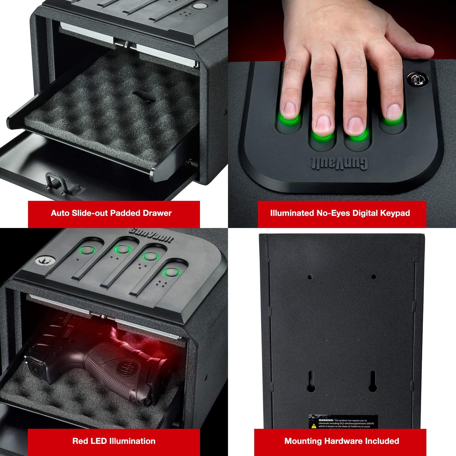 Details: The MiniVault compact gun safe by GunVault provides users the ability to access a handgun 20% faster than its predecessor. Upon entry of the correct code, the safe door simultaneously opens while the foam-padded auto slide-out drawer delivers unobstructed access to a handgun. Aiding in low-light conditions, a red LED illuminates the interior of the GV1050-19 for added confidence when you need it most. The MiniVault features the industry-leading illuminated No-Eyes digital keypad for fast access, even in the dark. Security features include heavy gauge steel construction, tamper proof concealed hinge and manual backup key with dimpled design for enhanced tamper resistance which offers superior protection for your handgun and valuables. The MiniVault safe also features a silent access mode, which allows the user to mute audio notification for discreet access.This is a California DOJ approved firearm safety device that meets the requirements of Penal Code section 23655 and the regulations issued thereunder.