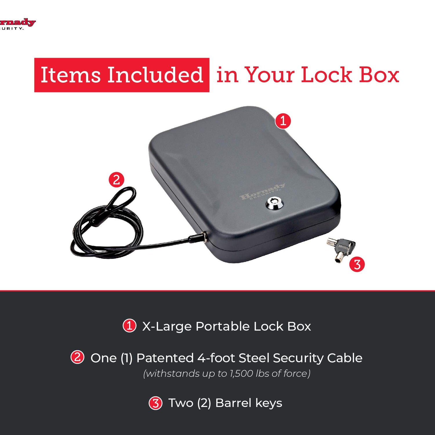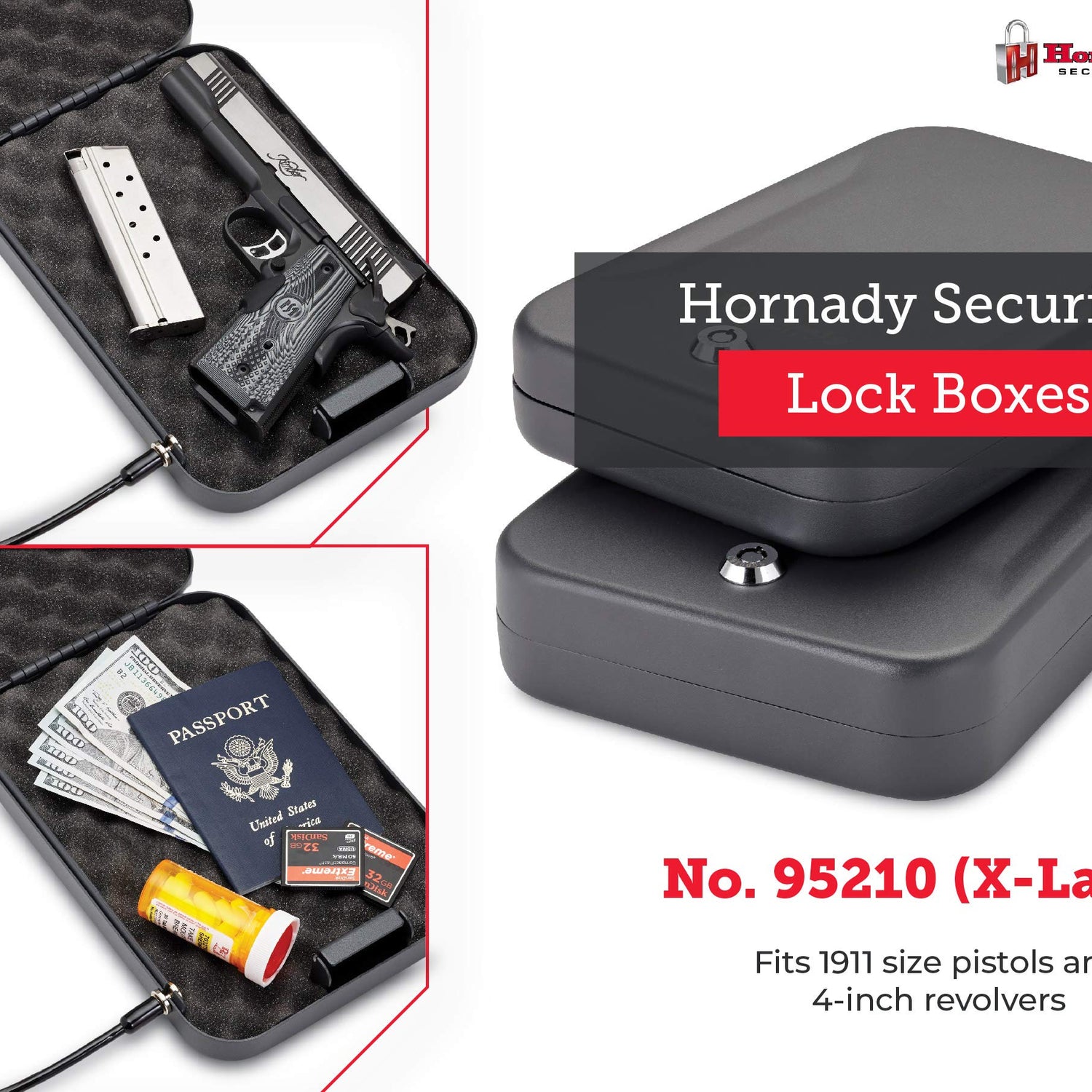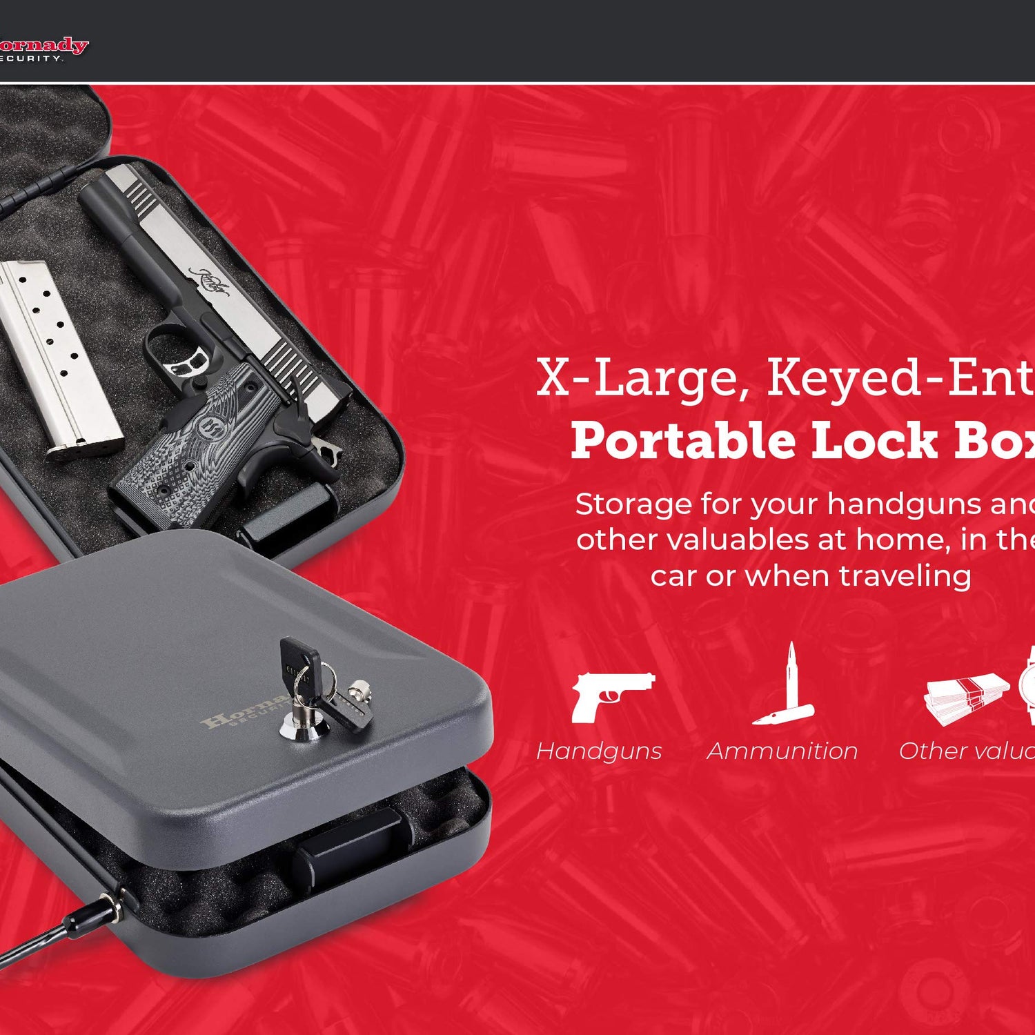 - Hornady Lock Box – Store your firearm and valuables with confidence. This extra large locked storage box provides a safe and secure place for your handguns and other valuables at home, in the car or when traveling