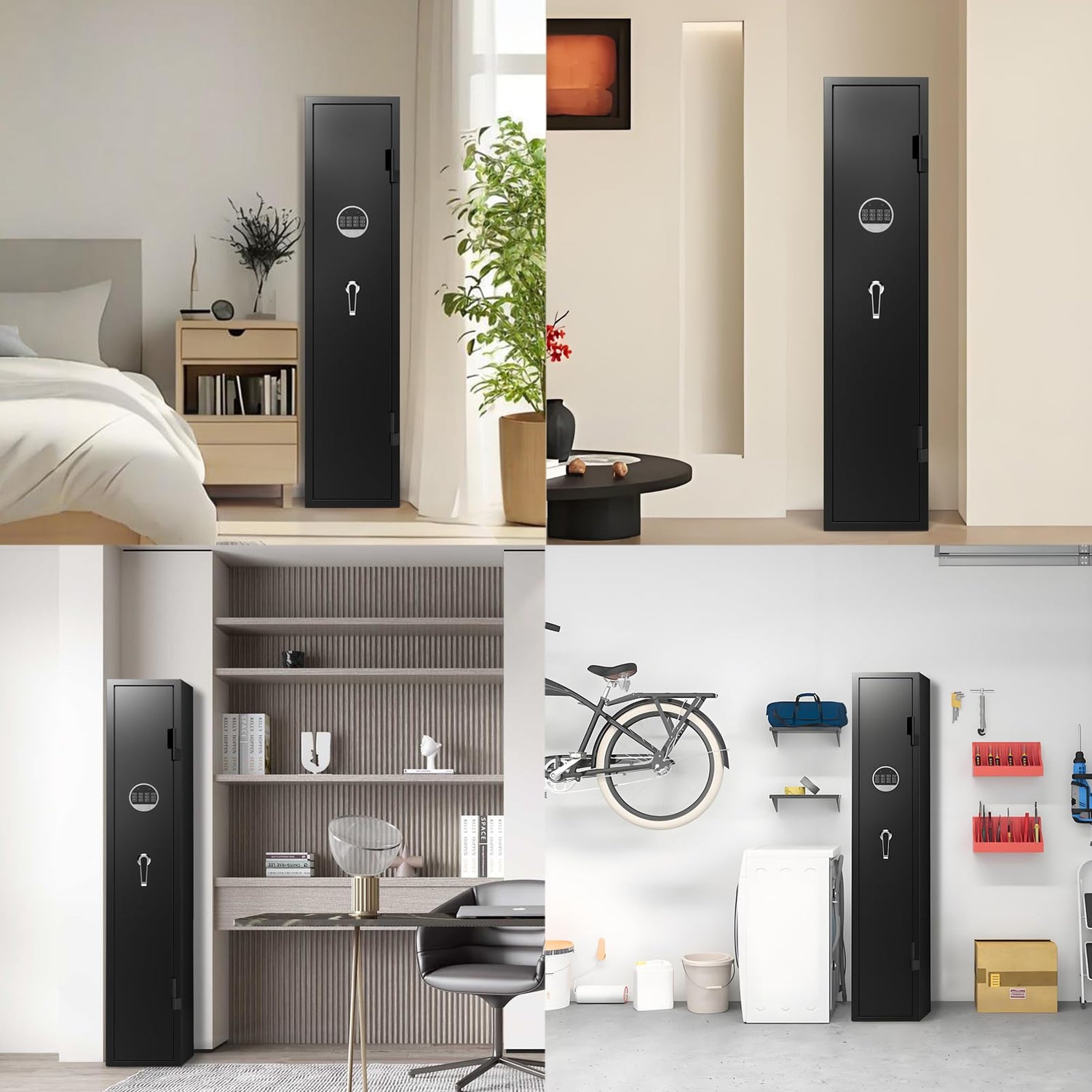 • 【Spacious Capacity】 This latest version of our gun safes is designed with practicality in mind, offering enough storage space to comfortably accommodate 2-3 rifles, making it the ideal choice for most households. Whether you are a hunting enthusiast or a shooting sports fan, this rifle cabinet is perfect for your needs. Please be sure to note the external dimensions: 54.33" H x 9.84" W x 9.84" D before purchasing to ensure it fits your space.