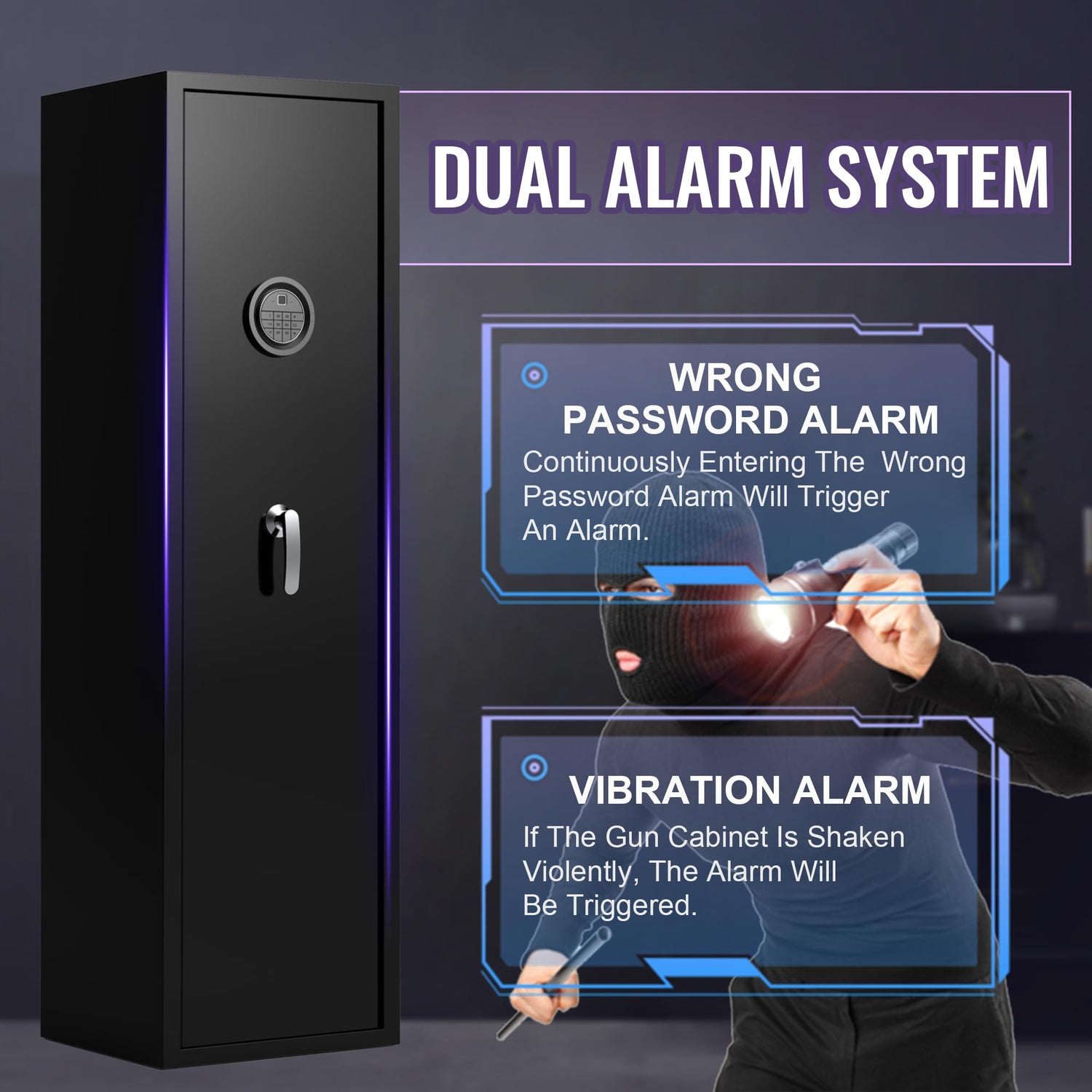 - 【Dual Alarm System & Built-in LED Light】The gun locker has a dual alarm system that activates after 3 consecutive incorrect passwords/fingerprint or violent vibrations, best to keep children or other unwanted visitors away, which can be stopped by entering the correct password. Built-in LED light let you use this gun storage cabinet even in the dark.