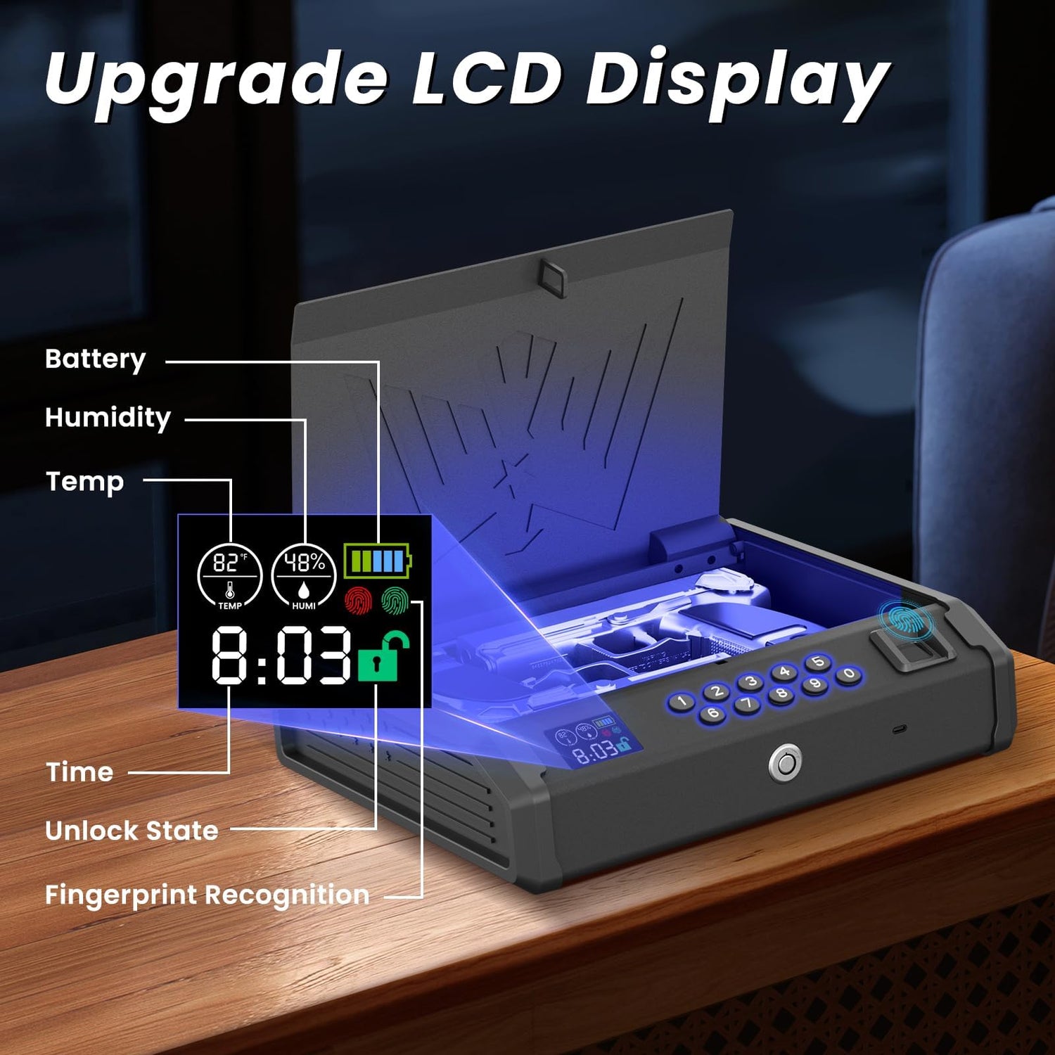 MOJOHAND Gun Safe for Pistols with LCD Display of Temperature Humidity, Fingerprint Quick-Access, Firearm Safety Device with Keys, Smart Handgun Safe for Nightstand, Car, 2 Gun Capacity