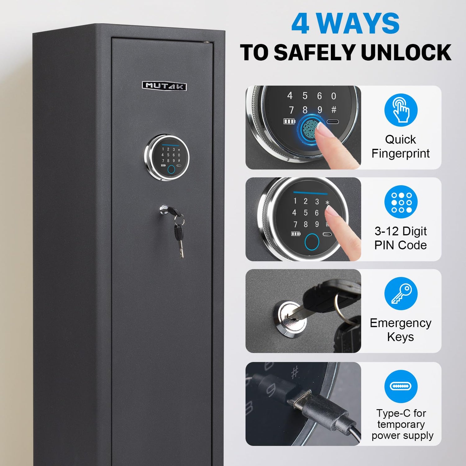 Mutak 4-5 Biometric Gun Safe for Rifle and Pistols, Long Gun Safe for Rifle Shotgun for Home, Quick Access 4-5 Gun Storage Cabinet with Handgun Pouch, Silent Mode (No Assembly Required)