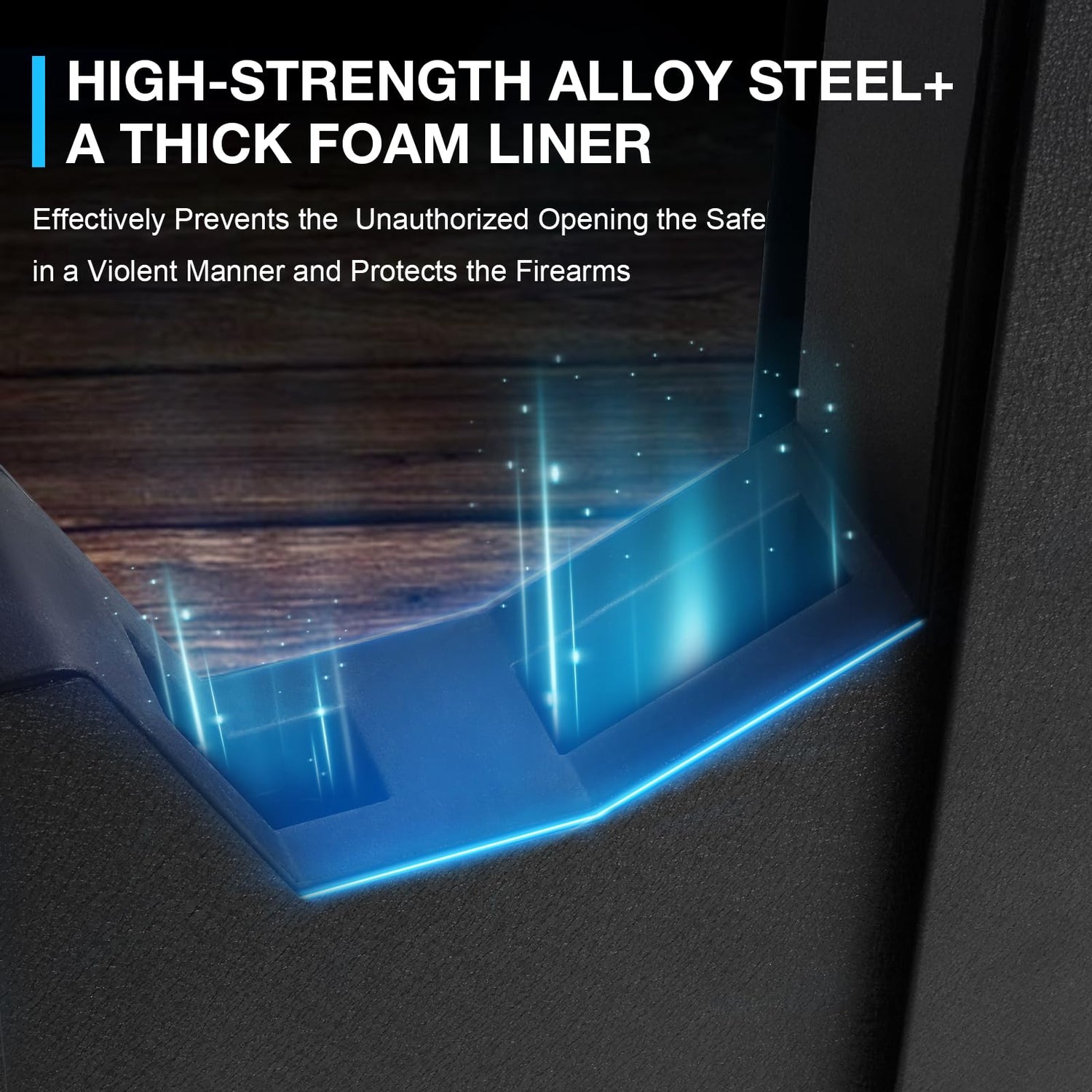- 4 Security Entry Methods: The Slider Pistol Safe features 4 security entry methods to protect your guns and valuables: Smart App, Fingerprint,PIN and Backup Key. High-resolution fingerprint unlocking, you can open the gun safe in 0.1 seconds, up to 60 fingerprint can be stored. 4 unlocking options provide flexible and quick access to the pistol safe, saving time and ensuring safety in dangerous moments.