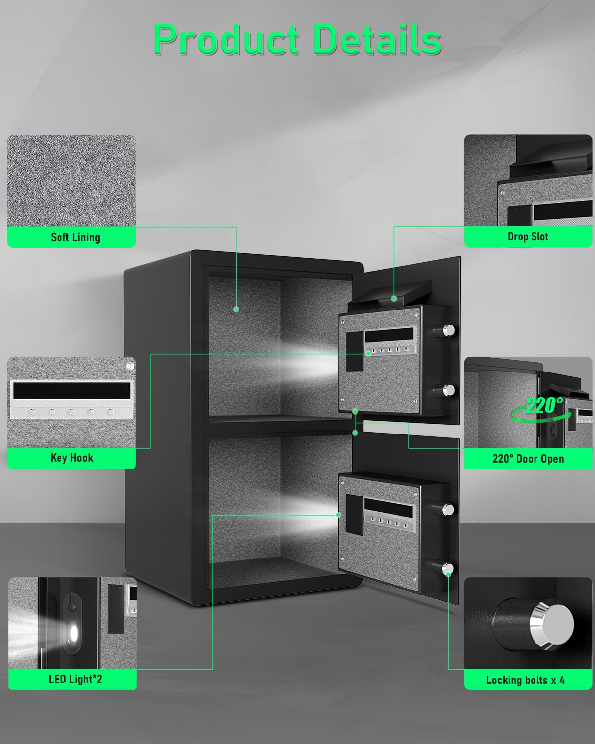 - 【Extra Large Security Safe Box】 The external size is 12.6"D x 13.8"W x 19.7"H. 2024 new upgraded double door design, which can open and operate separately. Omethey large safe box can meet the storage needs of your whole family, which can hold almost any valuables, like trophy, laptop, pistols, documents, cash, jewelry and more. Besides, we also add soft lining in the inner space, which can better protect your valuables from scratching.