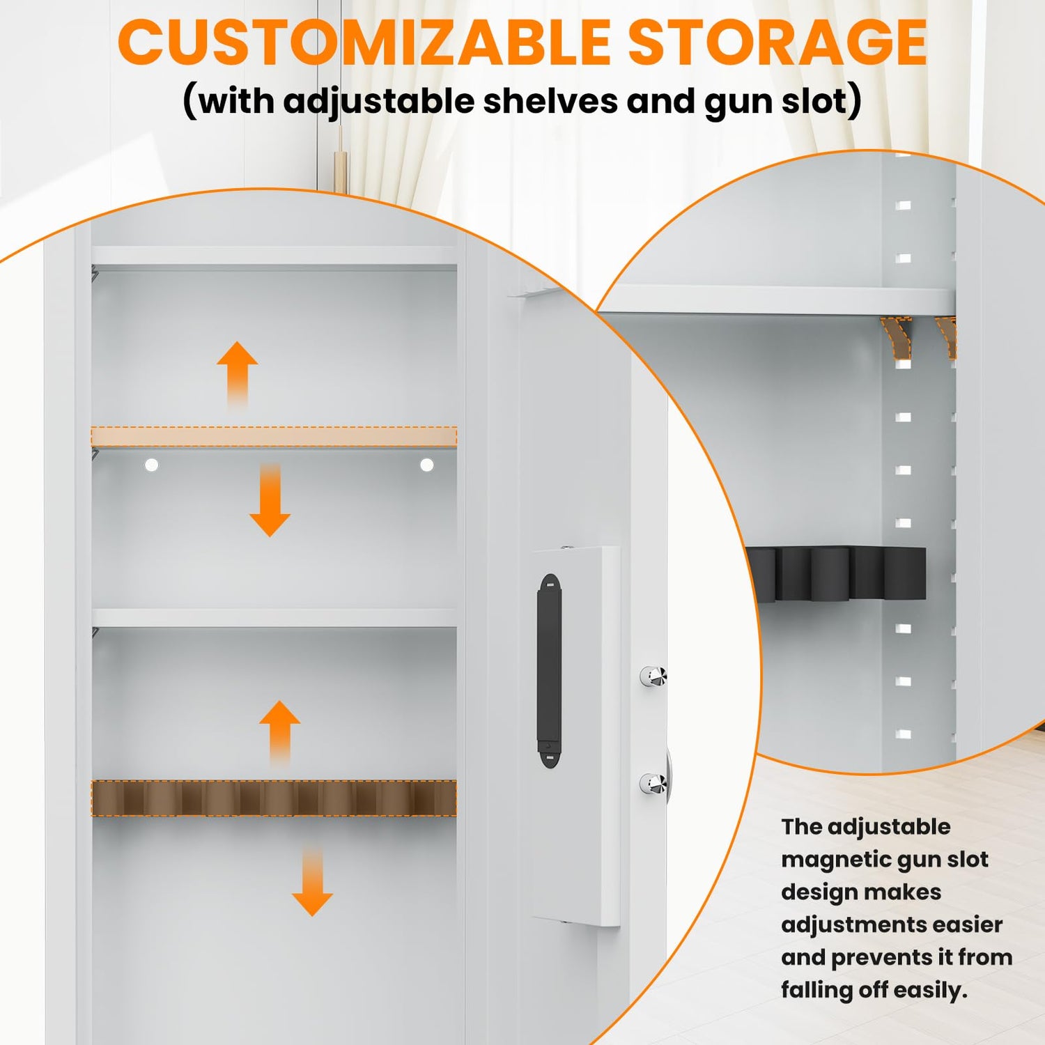 • 【Dual Alarm System and Silent Mode】The in wall safe are equipped with a dual alarm system. The vibration alarm is triggered by shaking or moving the gun cabinets, the input error alarm will be activated after 3 wrong password attempts. The buzzer will sound for 30 seconds when the alarm is activated, which can be heard throughout the house. To avoid being discovered by thieves or disturbing your children's sleep, it's a great to turn on the gunsafe's silent mode.