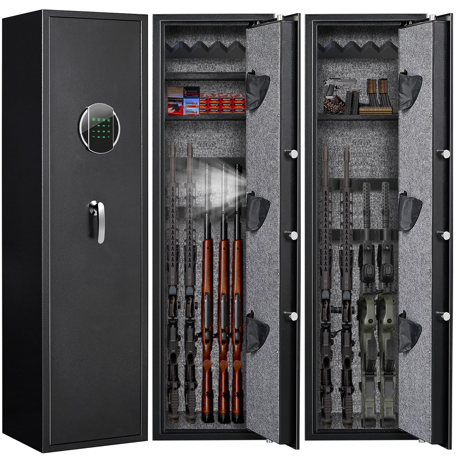 - 【Solid & Safe & Taller】Our rifle gun safe feature all-steel construction, the thickness of the steel plate is 11.81 gauge. There are 5 solid locking bolts on three sides, which can protect the gun cabinet from tampering and prying. With the flat door design, our gun safes have much smaller door gaps than other gun cabinets on the market, so it’s safer for your home. And the height is 57", it’s taller than most long gun safe on the market, can store longer guns like rifles and shotguns, up to 48''.