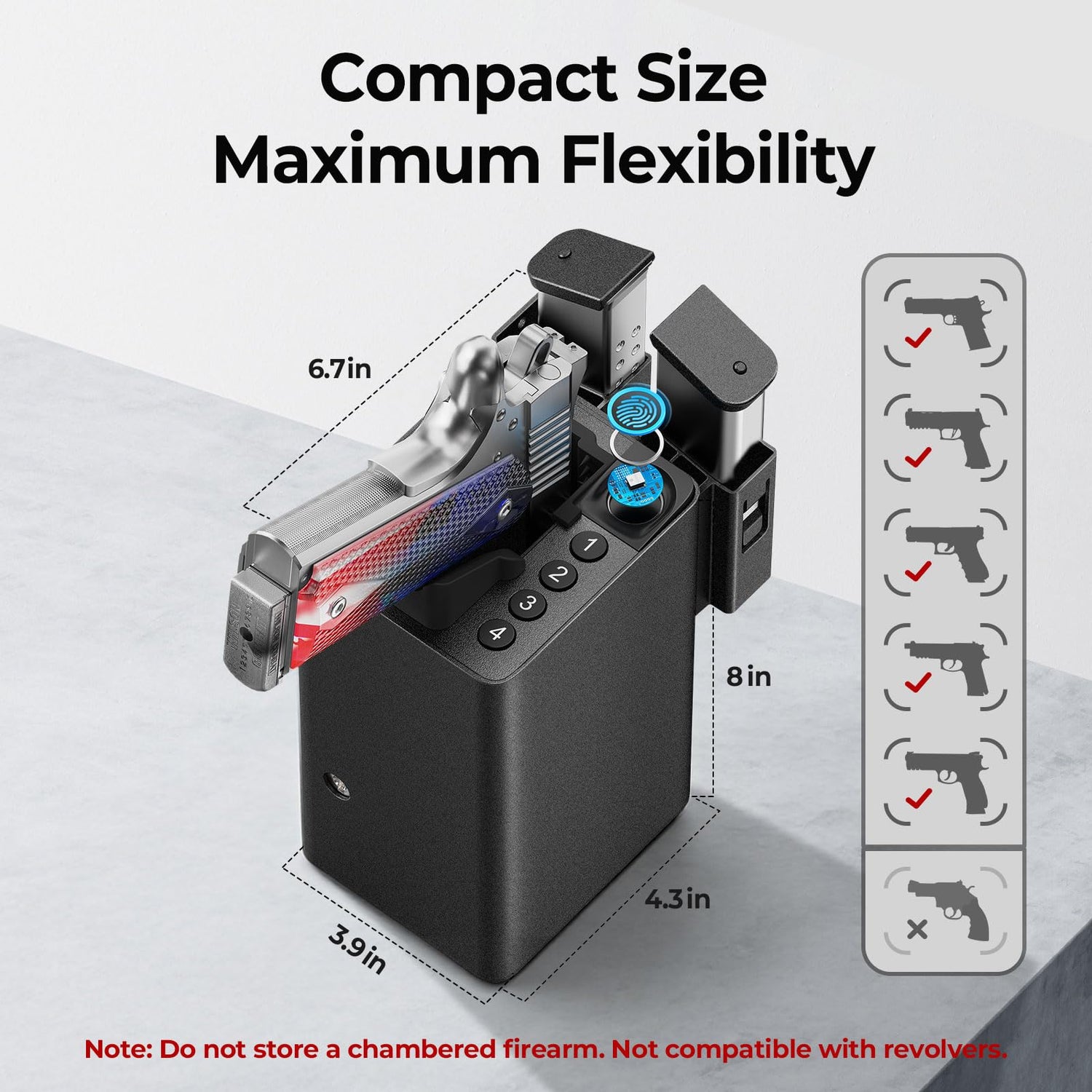 • Quick Access Design:This quick access handgun safe features advanced biometric technology with 0.1-second unlock speed; open-lid structure allows one-handed, immediate access during emergencies without lifting a cover