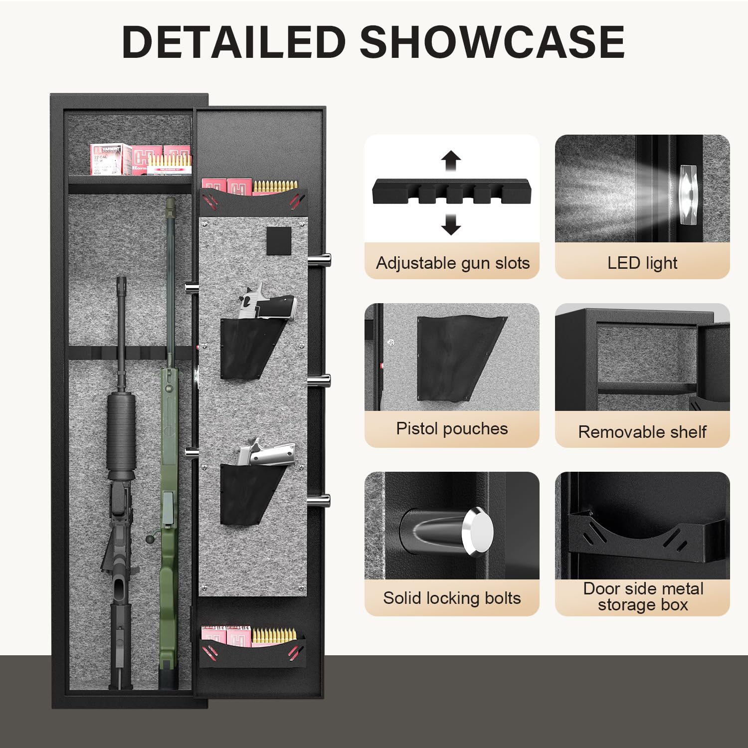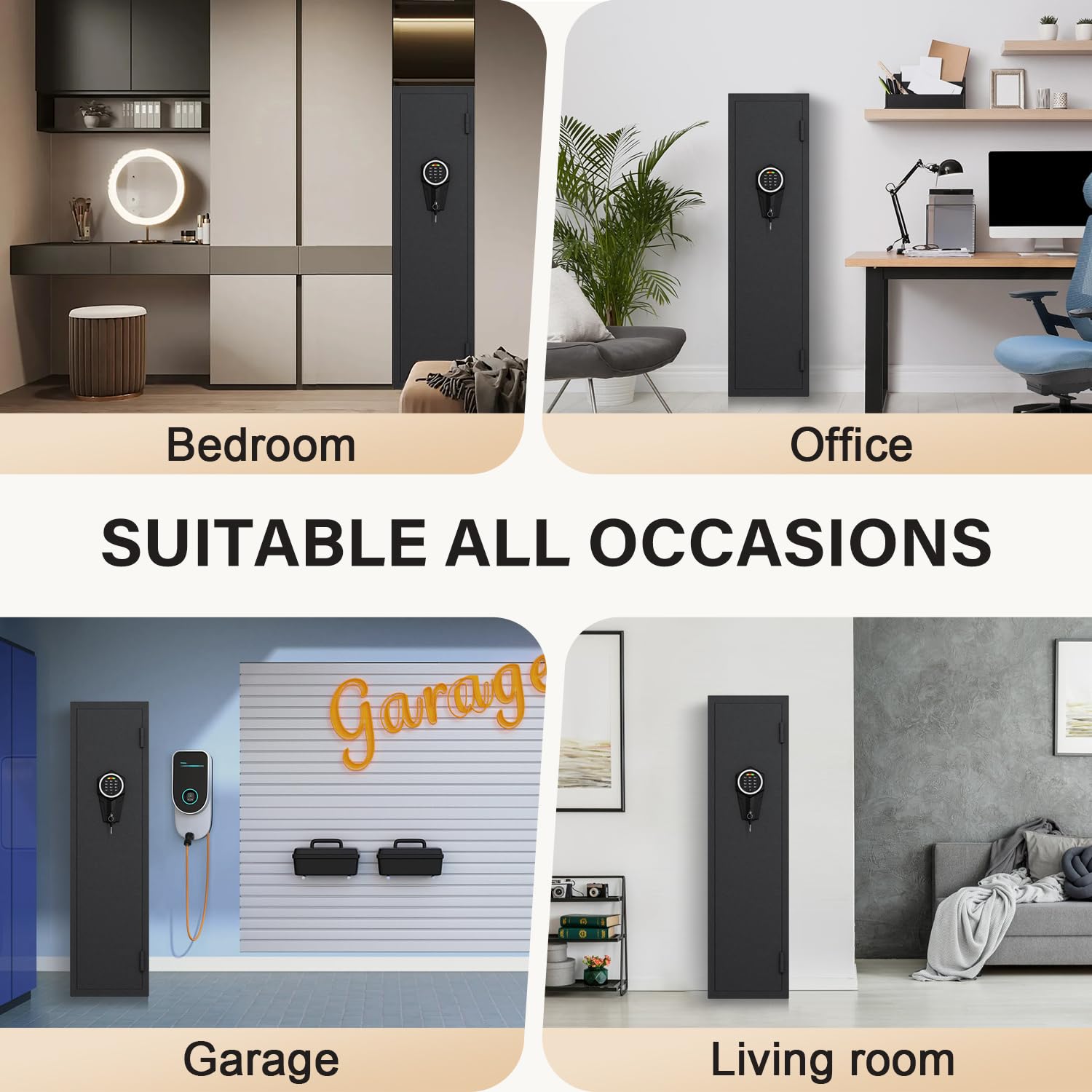 • 【1-2 GUN SAFE】The external dimensions are 9.05"D x 9.84"W x 47.4"H. Featuring a 2024 newly upgraded single-door design for operation. This Gun Safe is designed with practical functions to meet your storage needs, including a removable shelf that can hold up to two pistols. After removing the shelf and pistol rack, it can accommodate long guns up to 48 inches, fitting various sizes of rifles and shotguns.