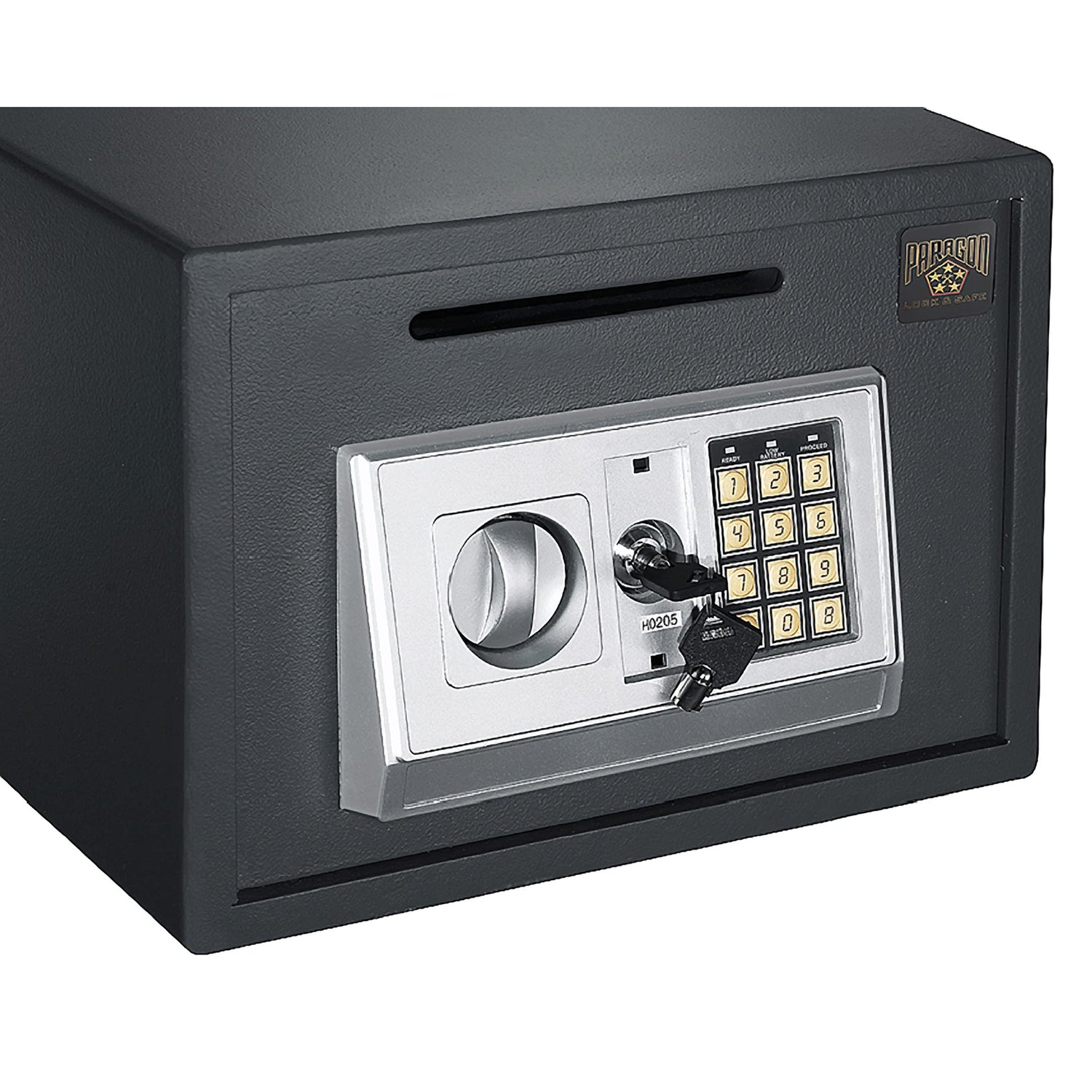 Details: Protect your cash or documents with the Digital Deposit Safe by Paragon Lock and Safe. This password protected money lock box is ideal for home or business and is designed with a front deposit slot so you can safely store cash or coin bags. The cash safe box can be mounted to the floor or wall for added security and comes with two manual override keys so that you can always retrieve your money out of the small lock box safe when needed. Rest easy knowing that your valuable assets are protected with this money safe deposit. IMPORTANT: Paragon Lock and Safe is committed to providing the consumer with the absolute best price and value on all of our products. NOTE: This is an exclusive product of Paragon Lock and Safe and ONLY Drop Slot Safes by Paragon Lock and Safe are GUARANTEED to be genuine. Avoid buying counterfeit products and transacting with unauthorized sellers. Paragon Lock and Safe is a registered trademark protected by U.S. Trademark law and will be vigorously defended.