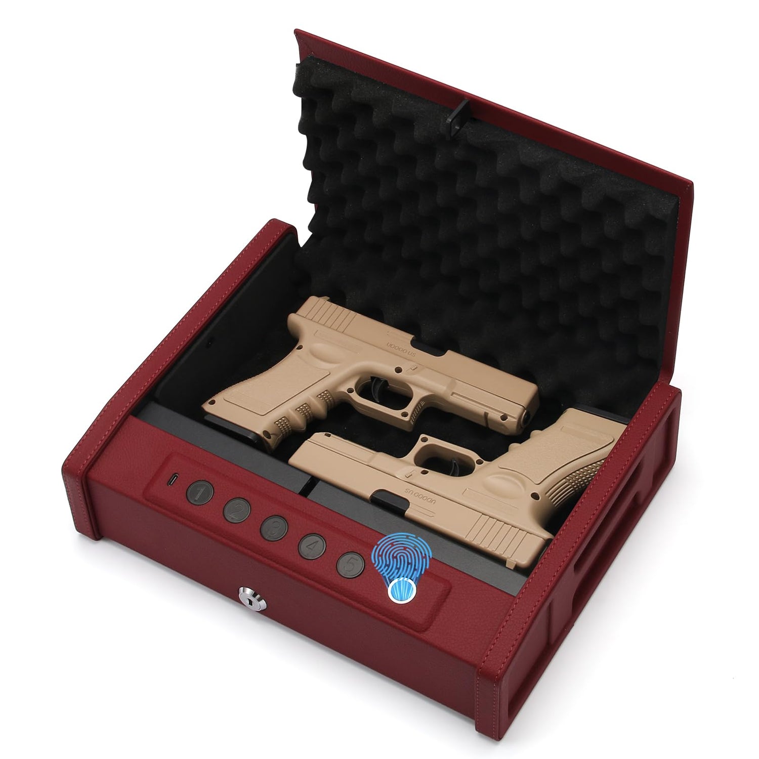Details: Secure your firearms with advanced technology using this smart biometric gun safe. Crafted from durable carbon steel, this wine red safe features multiple access methods including a fingerprint scanner, digital keypad, and convenient app control. The compact yet spacious design measures 15.5 x 11.4 x 4.7 inches, making it ideal for both home and vehicle storage. The interior is lined with protective foam padding to safeguard your valuables. With its built-in biometric sensor and app notification system, you'll always know when your safe is accessed. The integrated carry handle allows for easy transportation when needed. This safe can support up to 11 pounds of contents and includes wall-mounting capability for added security. Requires batteries for operation (not included). The combination of fingerprint recognition technology, digital access, and sturdy carbon steel construction provides reliable protection for your firearms and valuable items.