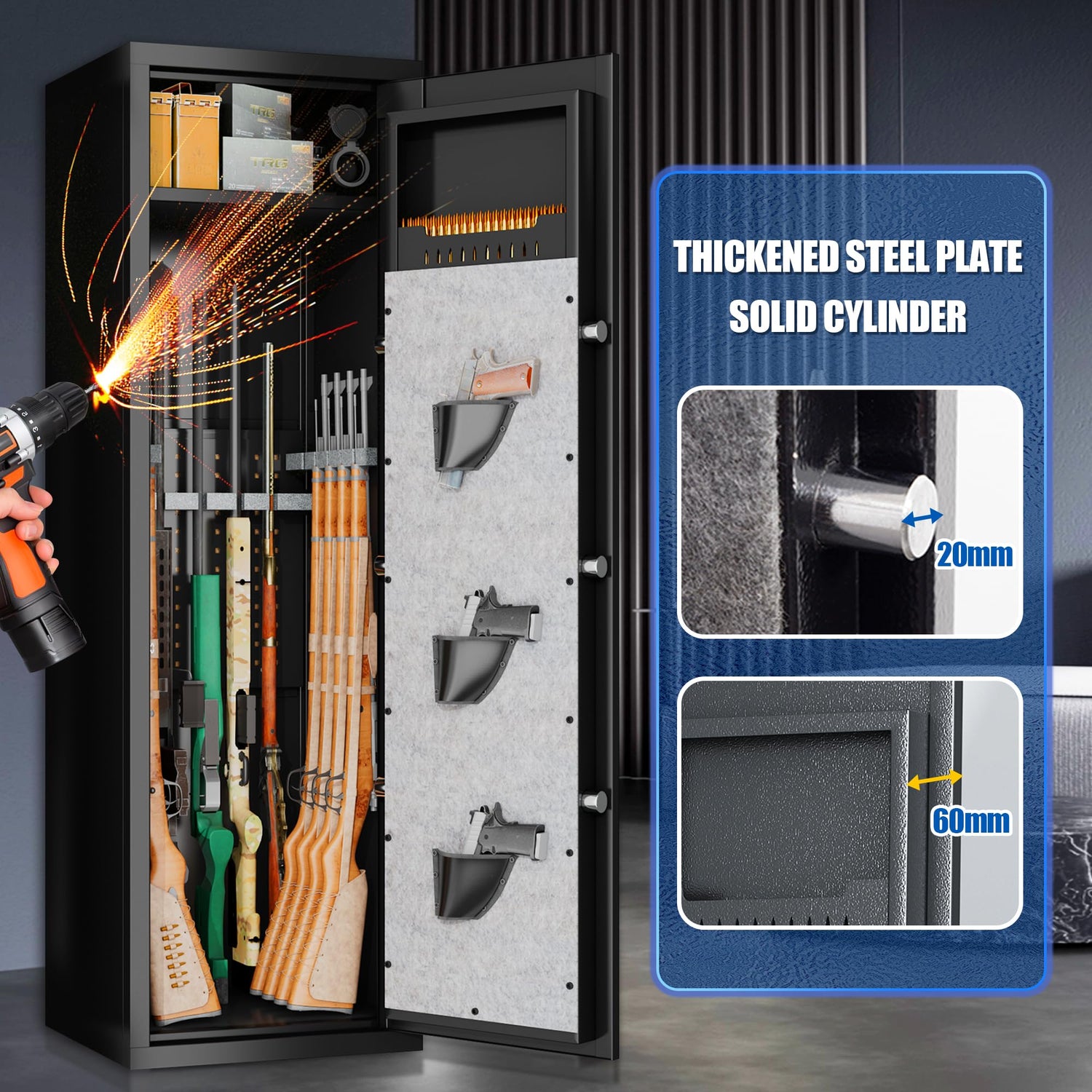- 【90 lbs HEAVY DUTY GUN CABINET,STRONGER】The cabinet body is made of thickened alloy steel plate,hammered by quenching,tempering and other multiple processes,the hardness is far more than ordinary steel,fireproof,explosion-proof,pry-proof,multi-layer protection against external aggression,guarding every firearm.