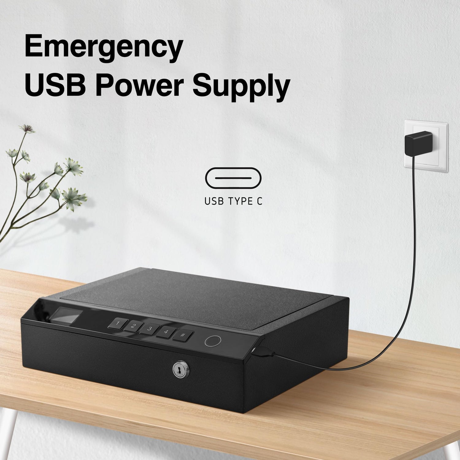 - 【USB Power】The biometric gun safe for handgun includes a built in emergency USB C power supply incase the battery failure or keys missing, unlock it with fingerprints or password. It will not charge the batteries, this feature is only used as temporary power for operation when the batteries are depleted.