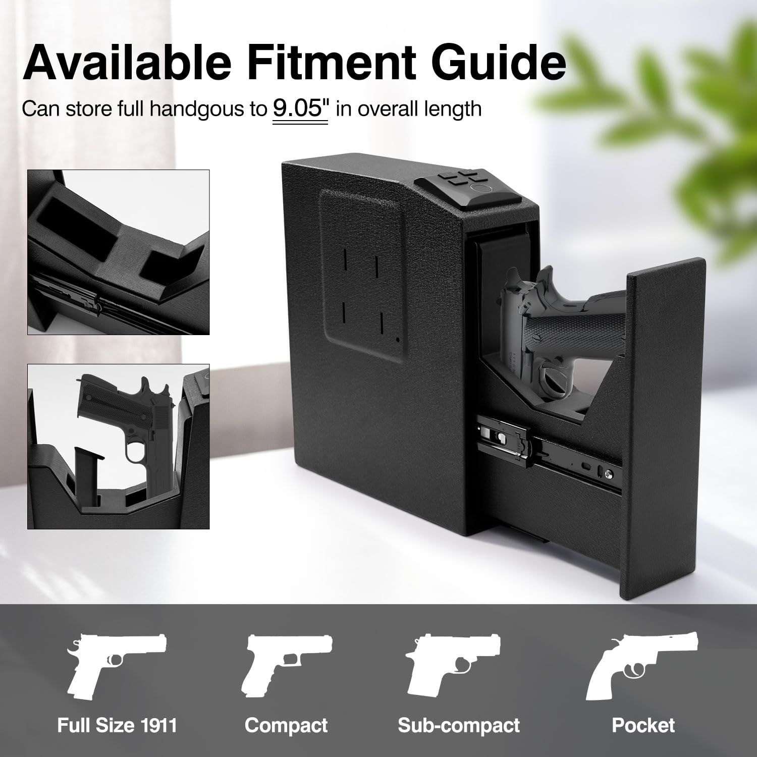 - 【Sider Gun Safe Design】With the mounted design and portable hidden design, biometric slider gun safe for handgun makes it convenient for you to keep pistols safely stored whether at home or in a RV. It can be stored inconspicuously under a desk, or in a nightstand to avoid accidental touching of your children as well as to better protect you and your family.