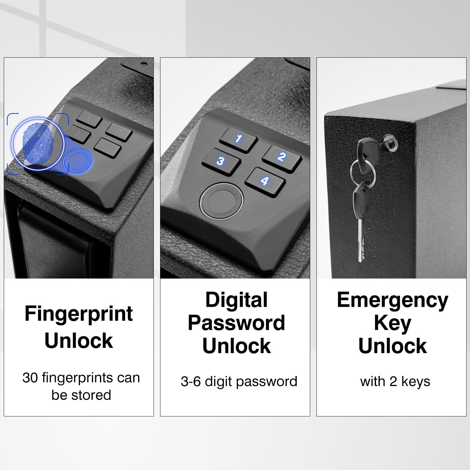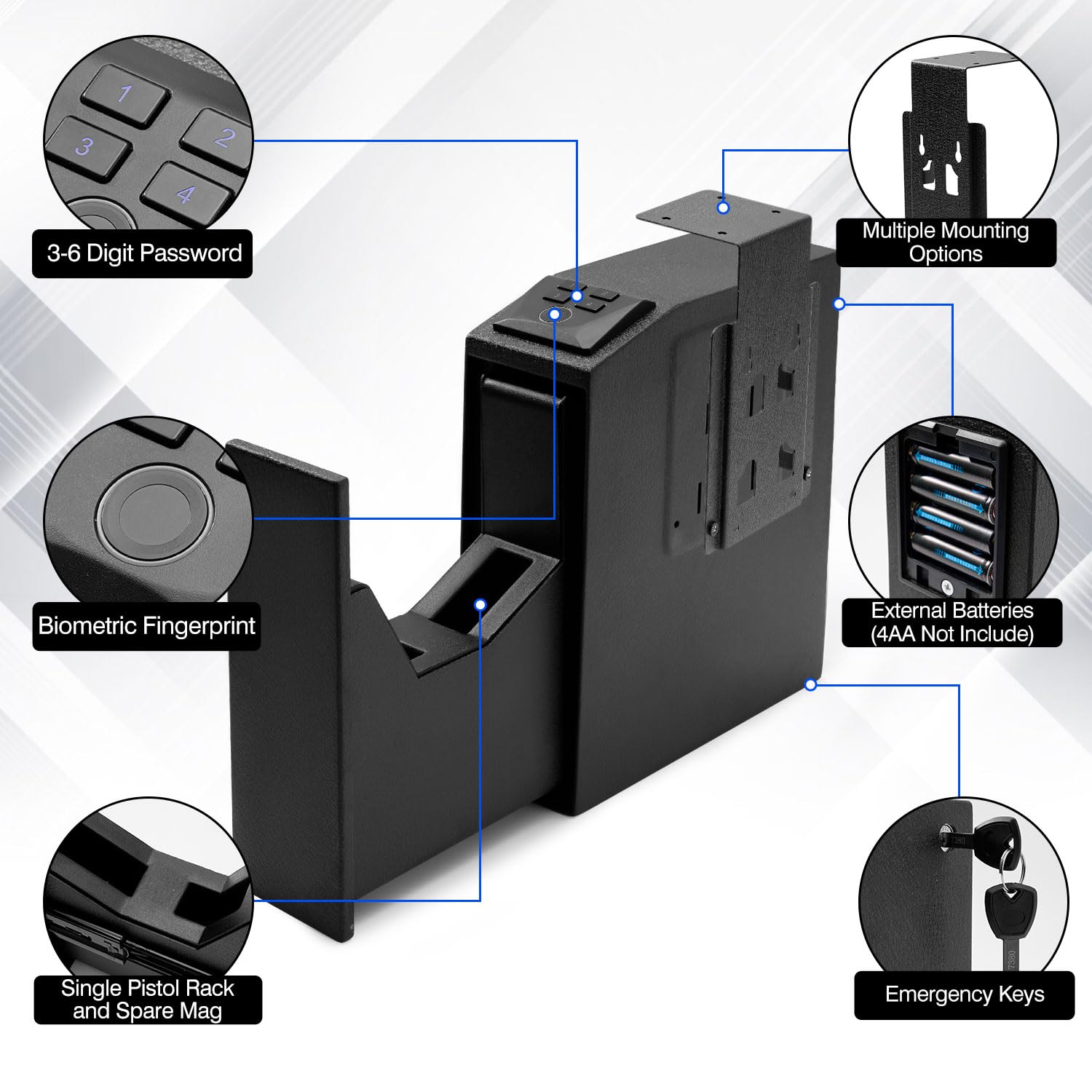 - 【3 Ways Quick Access Mode】The beside hand gun safe allows you to get quick access to your handgun through one-handed operation in just a fraction of a second. The mounted sider hand gun safe can also be locked with keypad or fingerprint in case of emergency, bringing your life more convenience and security at the same time.