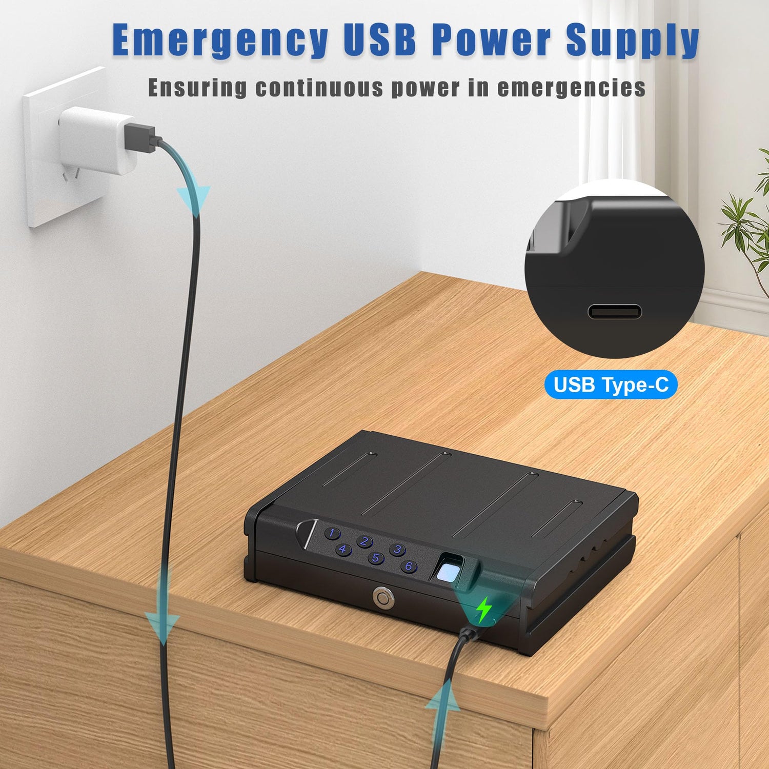 • 【Multiple Access Options & Advanced Features】The bedside gun safe for handgun offers multiple access methods, including a biometric scanner, digital keypad, and backup keys. Silent mode and built-in LED lighting ensure easy use even in low-light conditions. The USB-C port provides backup power to ensure uninterrupted operation.