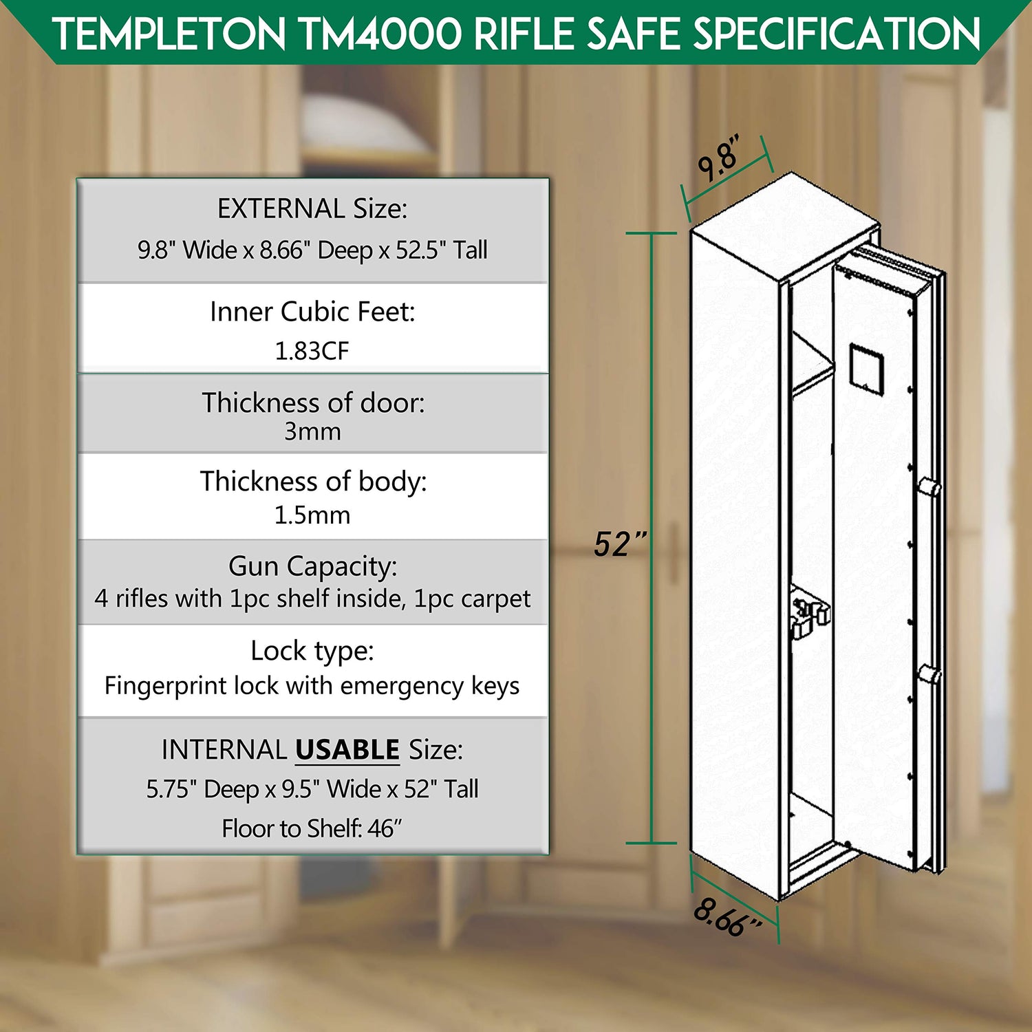 Templeton Quick Access Biometric Rifle and Gun Safe with Silent Mode - 4 Standard Rifle Capacity (without accessories)