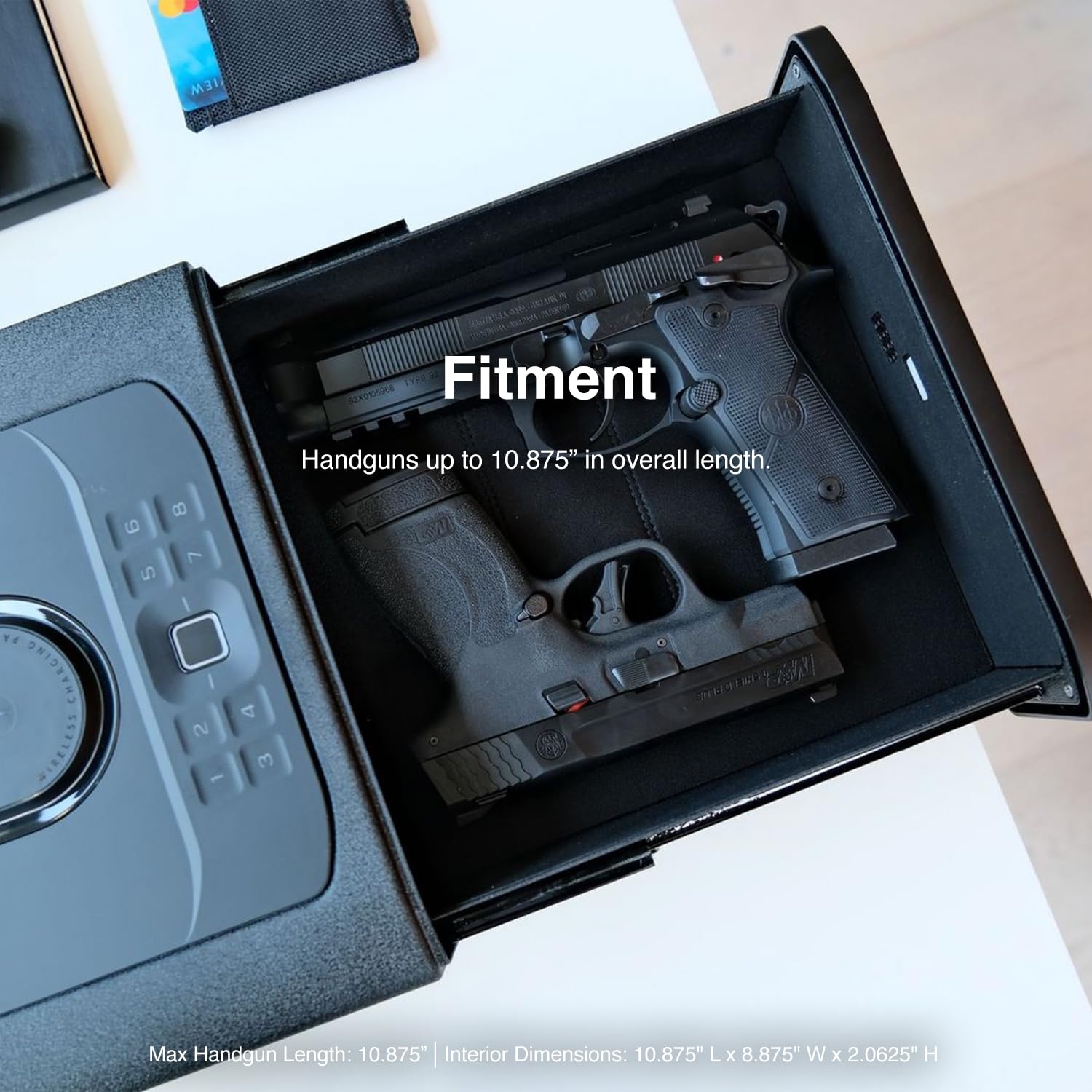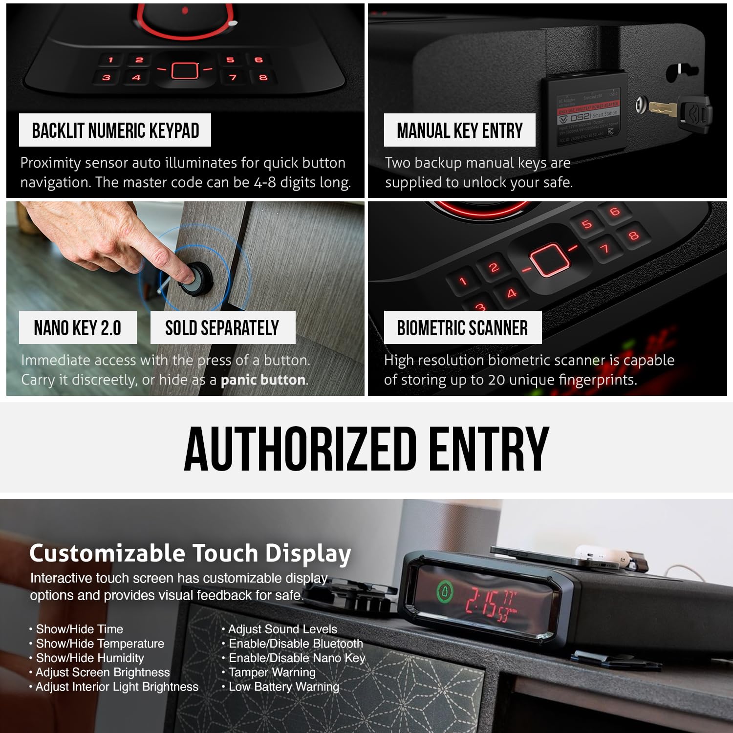 • Expanded Storage and Increased Power: Fully loaded with top of the line modern upgrades and powerful charging capabilities; top dual wireless charging pad, 2 USB, and 2 USB-C accessory charging ports. Quick access auto-open drawer can secure two full-size pistols with a maximum length up to 10.875", magazines, and other personal belongings. The sleek customizable LED display shows time/temperature/humidity and can be blacked out for the ultimate modern home safe. Low profile safe design blends into its environment, great for RVs or nightstands.