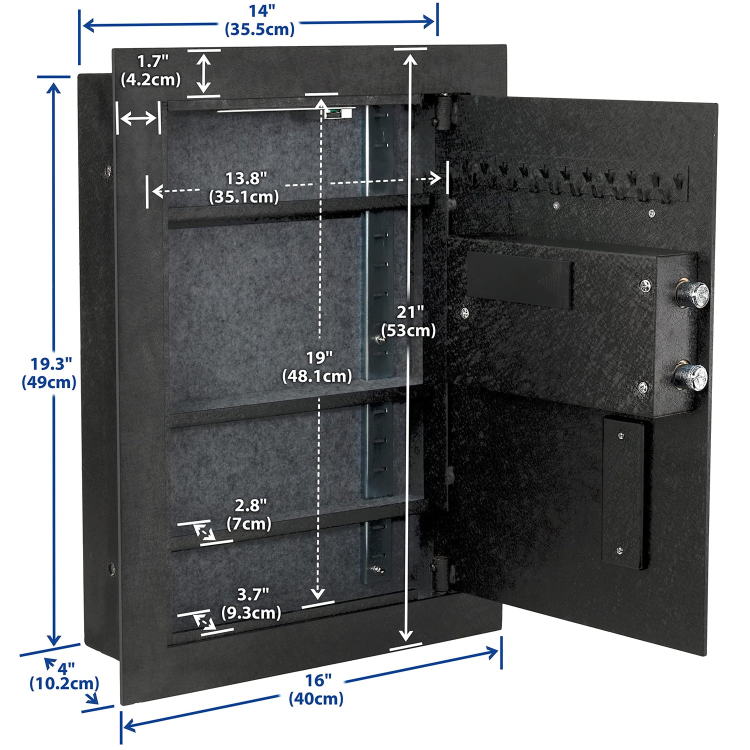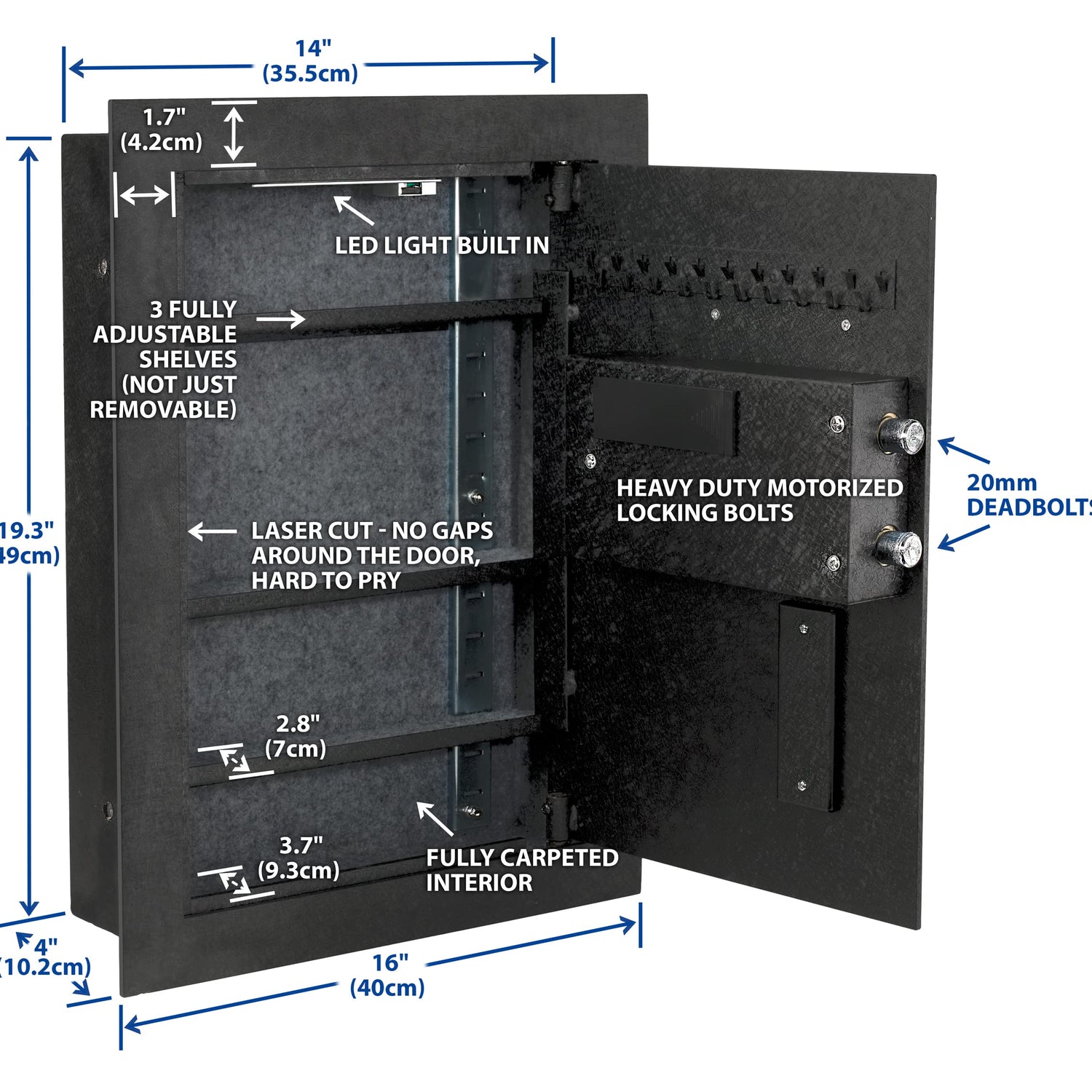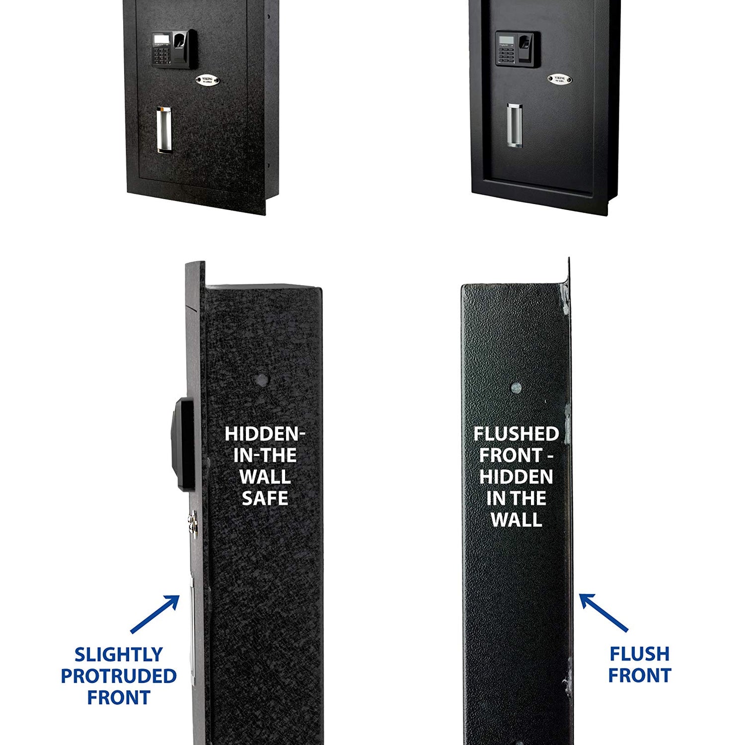 • 🌟 HIGHLY SECURE 19.3" x 14" x 4" 39lbs. BIOMETRIC FINGERPRINT SAFE FITS BETWEEN STUDS IN THE WALL - Unlocks Fast by Registered Fingerprint or PIN Code. Retains memory even if batteries are removed