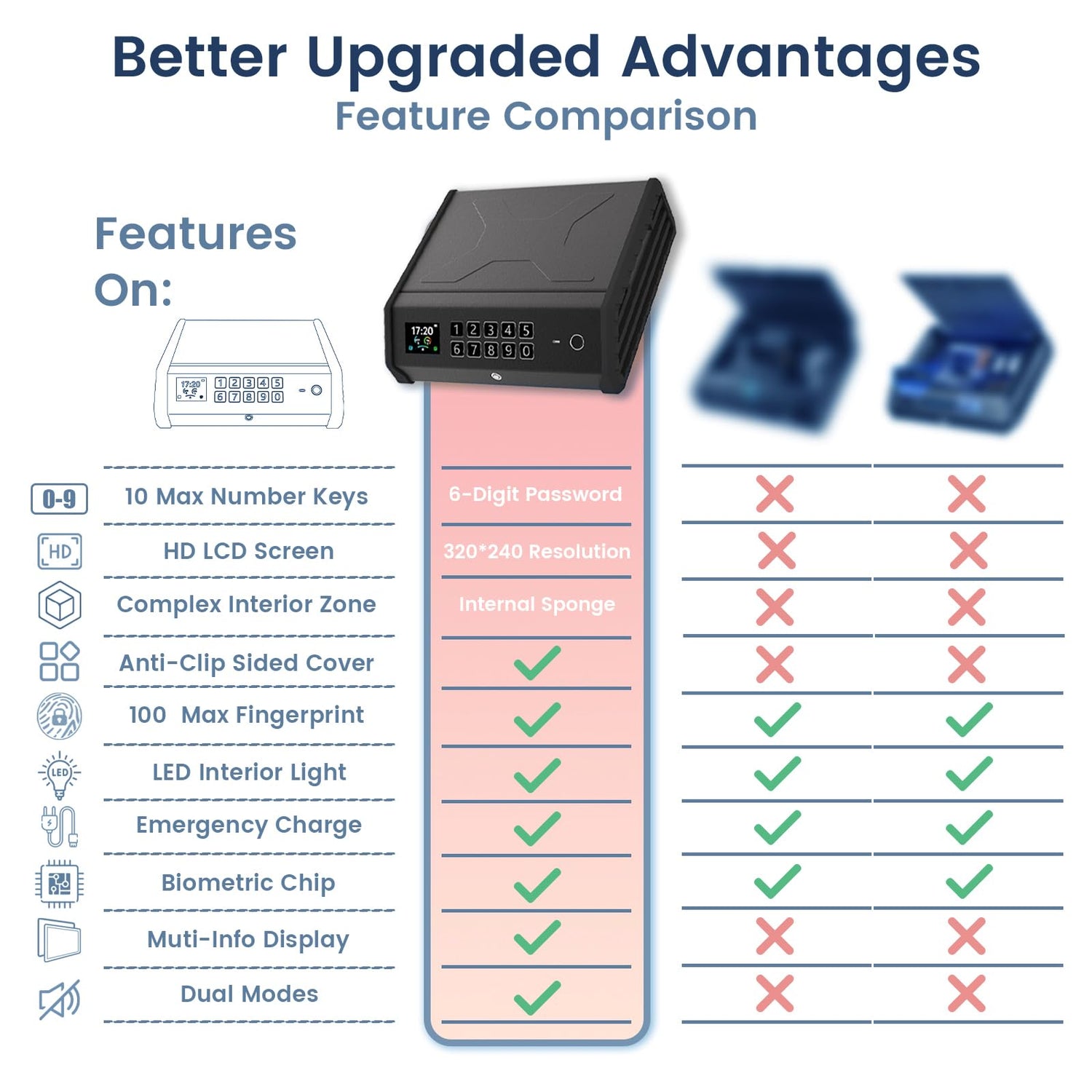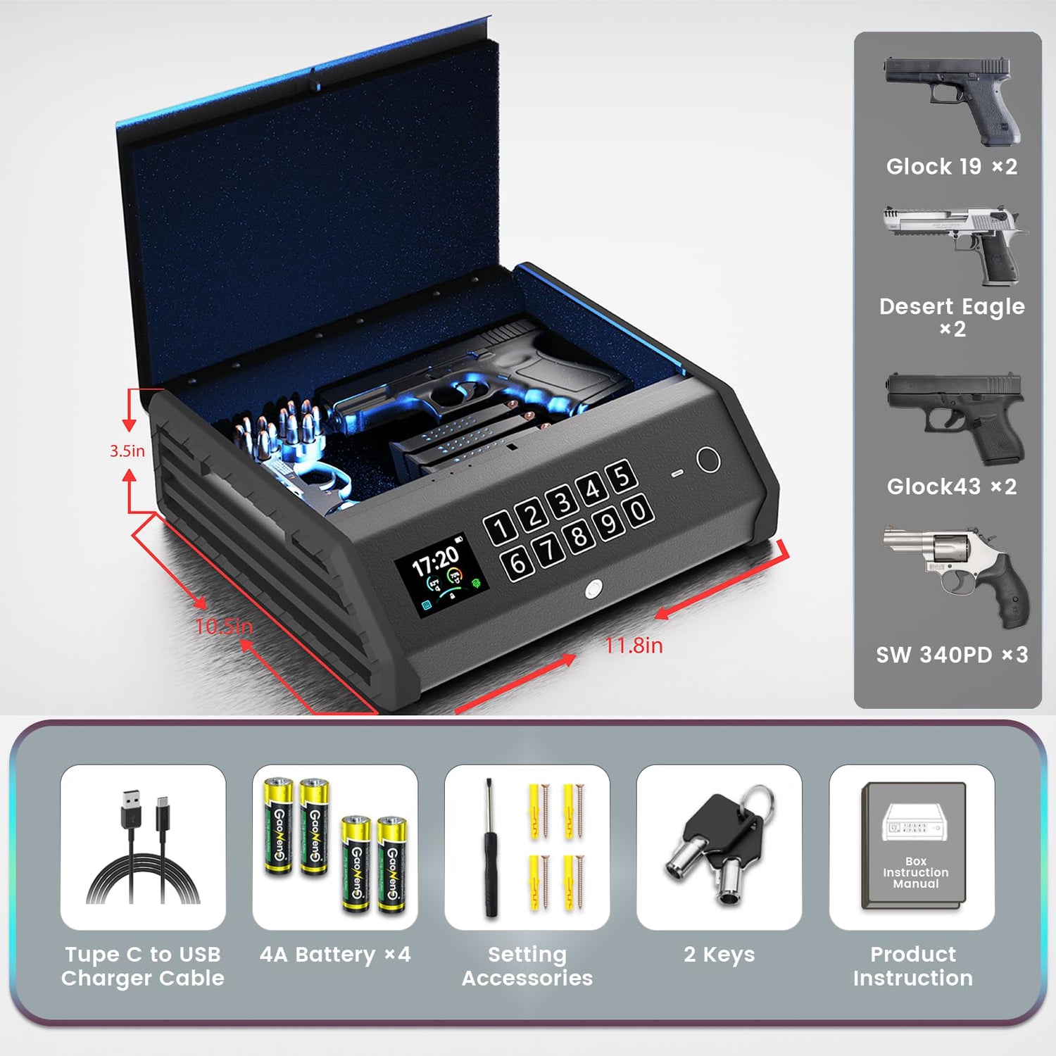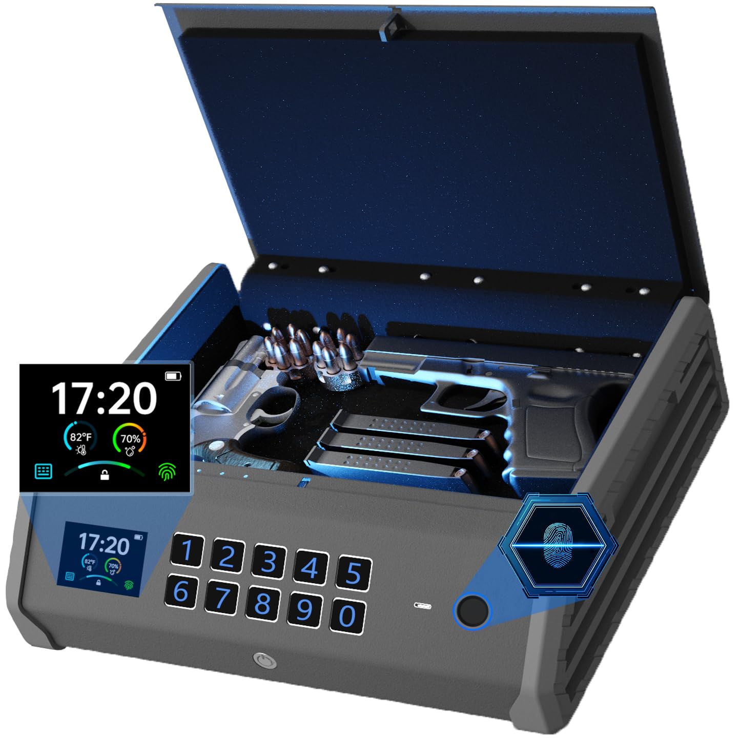 WodPeace Gun Safe for Pistols,Biometric Gun Safe,Fast Access Handgun Lock with Internal Light, Multi-Info Display Screen,Silent Mode,Fingerprint/PIN Code/KEY,Smart Box for Bedside Nightstand Car