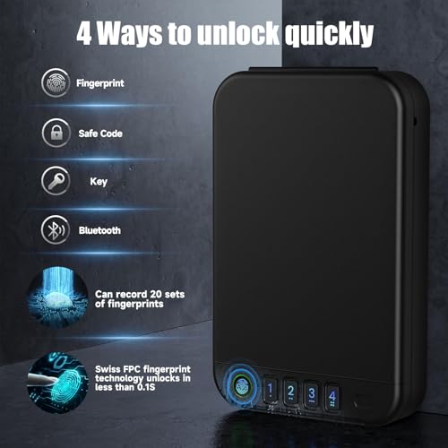 - Multiple Unlocking Methods: This portable gun safe four unlocking methods, including fingerprint, password, key, and bluetooth, to meet various user needs. It can store up to 20 sets of fingerprints, with a fingerprint response time of less than 1 second, No problem opening and closing 100 times in a row.