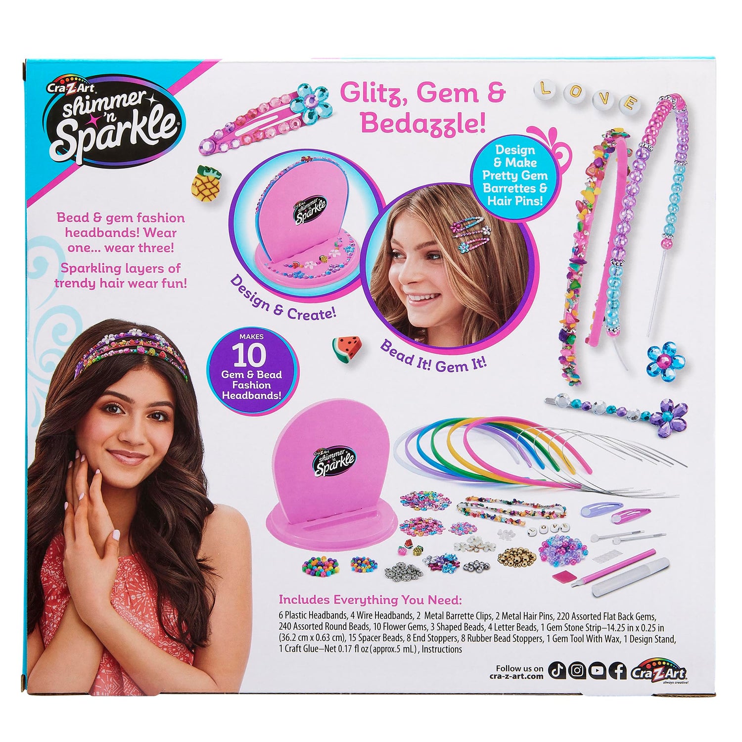 • HEADBANDS AND BARRETTES - Glitz, gem and bedazzle with the amazing Shimmer N Sparkle Headbands and Barrettes! Make beautiful, beaded wire headbands, gem filled plastic headbands, pretty gem barrettes & hair pins! Makes 10 gem and bead fashion headbands in total plus 4 clips.