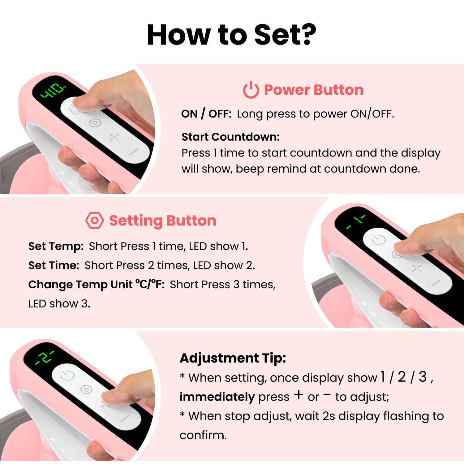 - Very Easy to Set: Long press to power on/off; Set Temp --Short Press 1 time the setting button, LED shows 1; Set time --Short Press 2 times the setting button, LED shows 2; Change temp unit ℃/℉--Short Press 3 times the setting button, LED shows 3