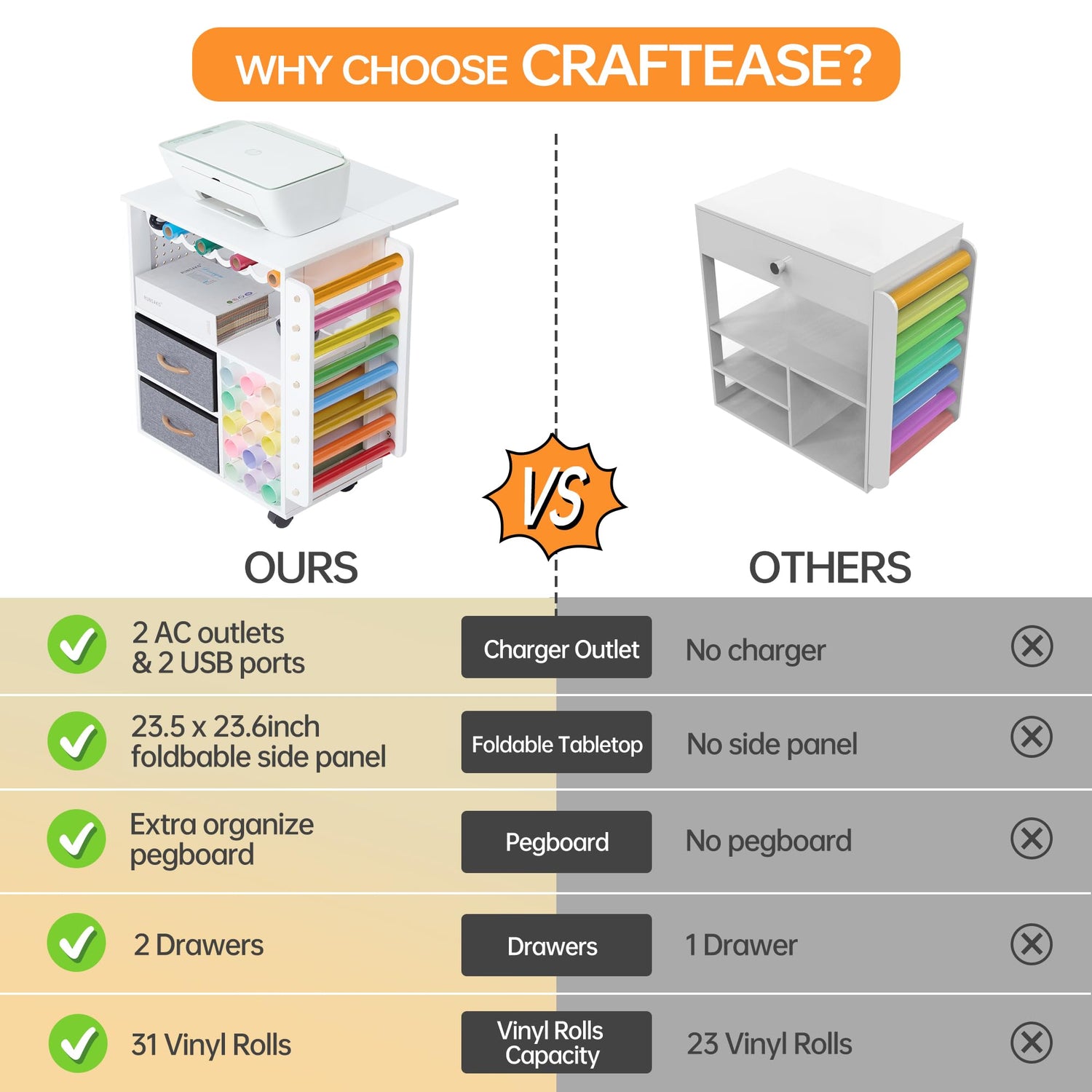- Foldable Tabletop - The top and bottom open shelf gives you enough storage space to place craft machine, with the foldable side plate allows you to extend the tabletop even bigger! with 2 wave hooks, bottom vinyl roll holder and side hanging vinyl roll organizer can totally hold up to 31 vinyl rolls. The table side has a retangular pegboard, for freeing up workspaces and keeping tools neatly organized.